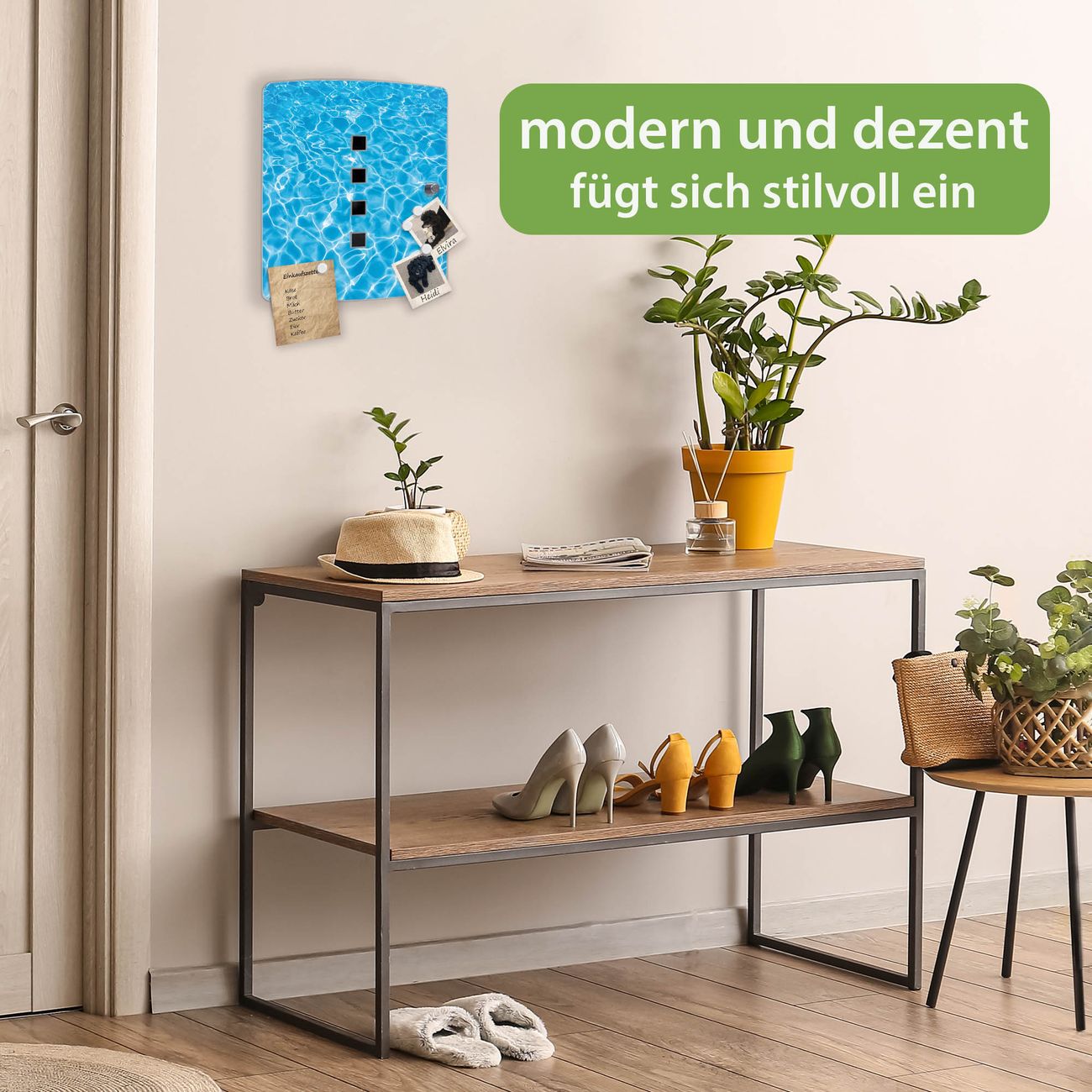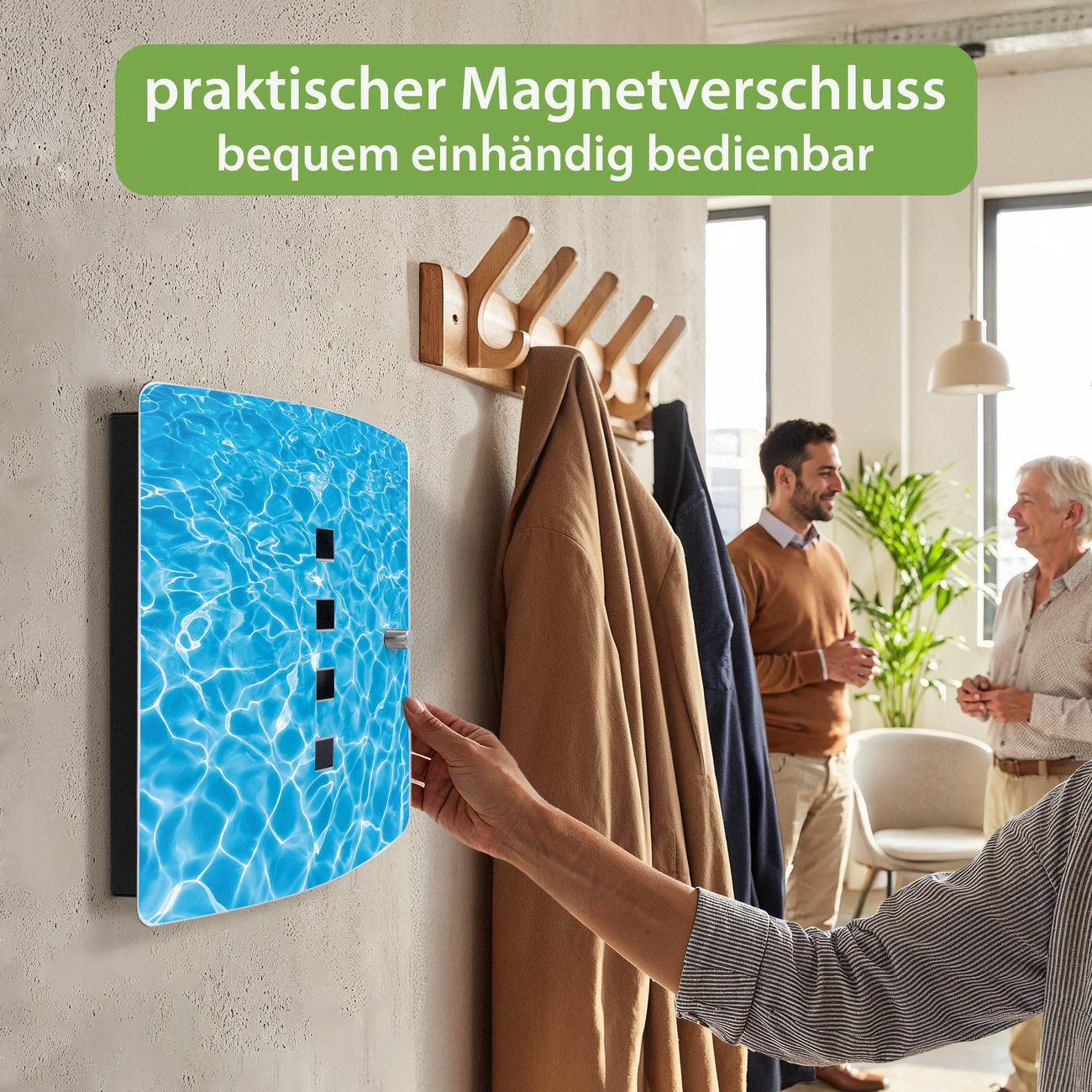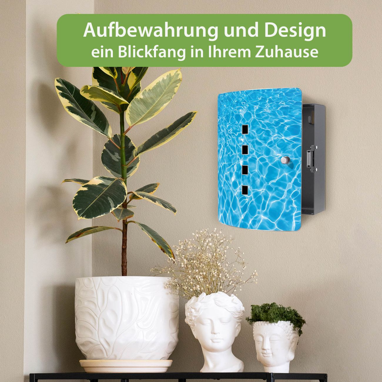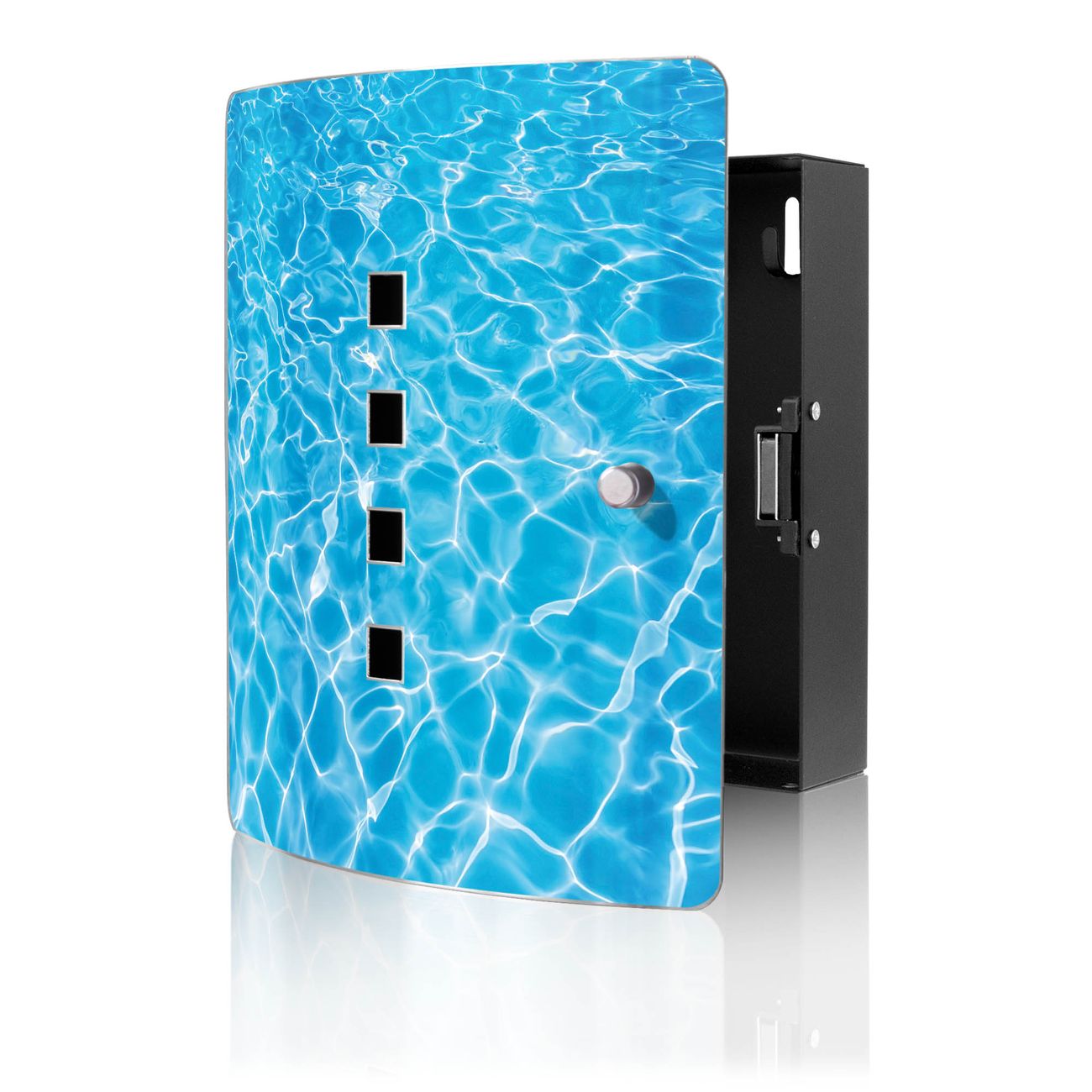 Funktion / Nutzen: Die leicht geschwungene Edelstahltür ist mit einer hochwertigen Motivfolie und dem Motiv Motiv Wasseroberfläche kaschiert. Ein praktischer Magnetverschluss ermöglicht Ihnen ein schnelles Öffnen und Schließen. Befestigt wird der Schlüsselkasten an 2 Stellen auf der Rückseite, passendes Montagematerial fügen wir bereits bei.