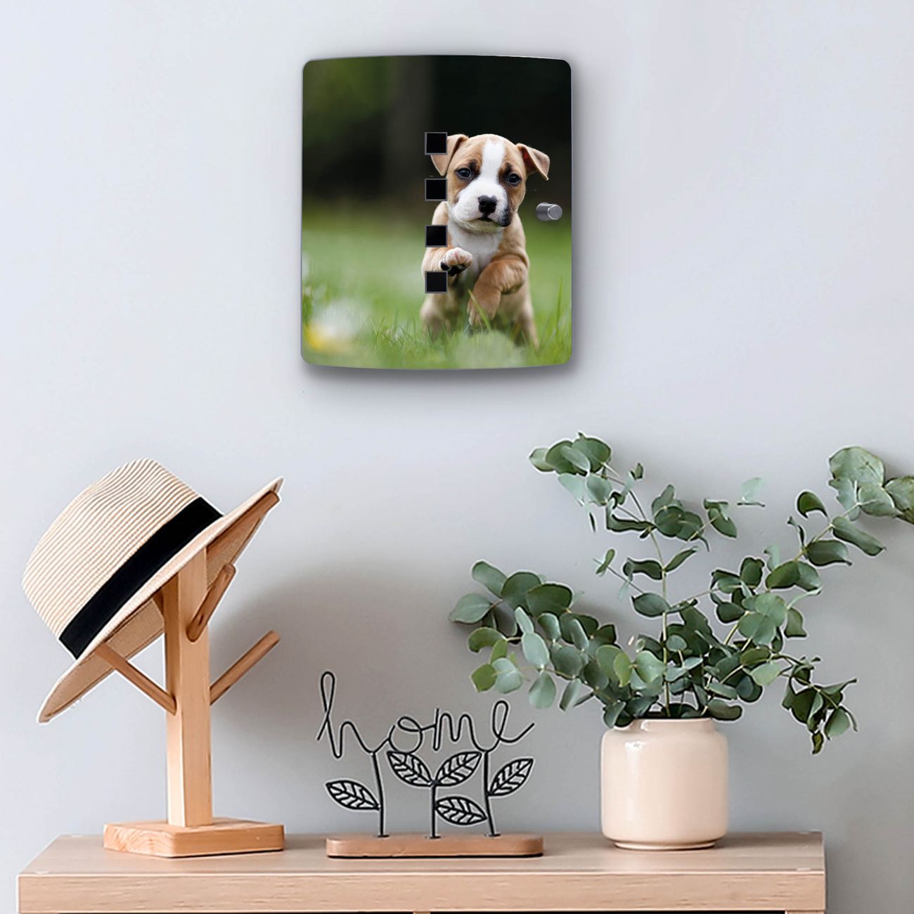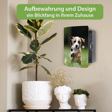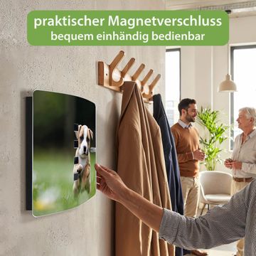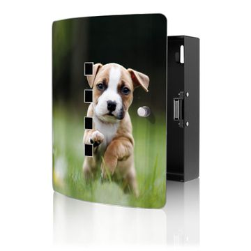 Funktion / Nutzen: Die leicht geschwungene Edelstahltür ist mit einer hochwertigen Motivfolie und dem Motiv Motiv Welpe im Gras kaschiert. Ein praktischer Magnetverschluss ermöglicht Ihnen ein schnelles Öffnen und Schließen. Befestigt wird der Schlüsselkasten an 2 Stellen auf der Rückseite, passendes Montagematerial fügen wir bereits bei.
