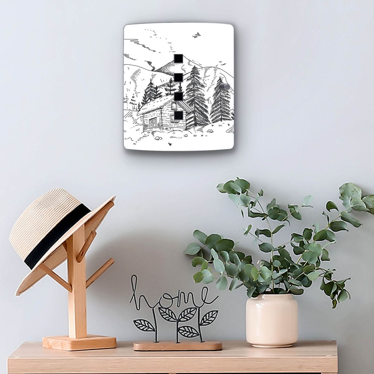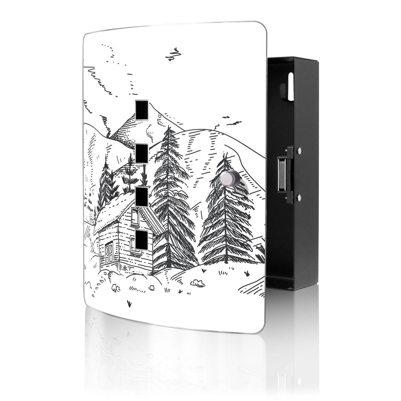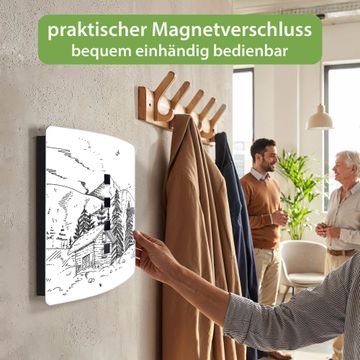 Funktion / Nutzen: Die leicht geschwungene Edelstahltür ist mit einer hochwertigen Motivfolie und dem Motiv Motiv Winterliche Berghüttenidylle kaschiert. Ein praktischer Magnetverschluss ermöglicht Ihnen ein schnelles Öffnen und Schließen. Befestigt wird der Schlüsselkasten an 2 Stellen auf der Rückseite, passendes Montagematerial fügen wir bereits bei.