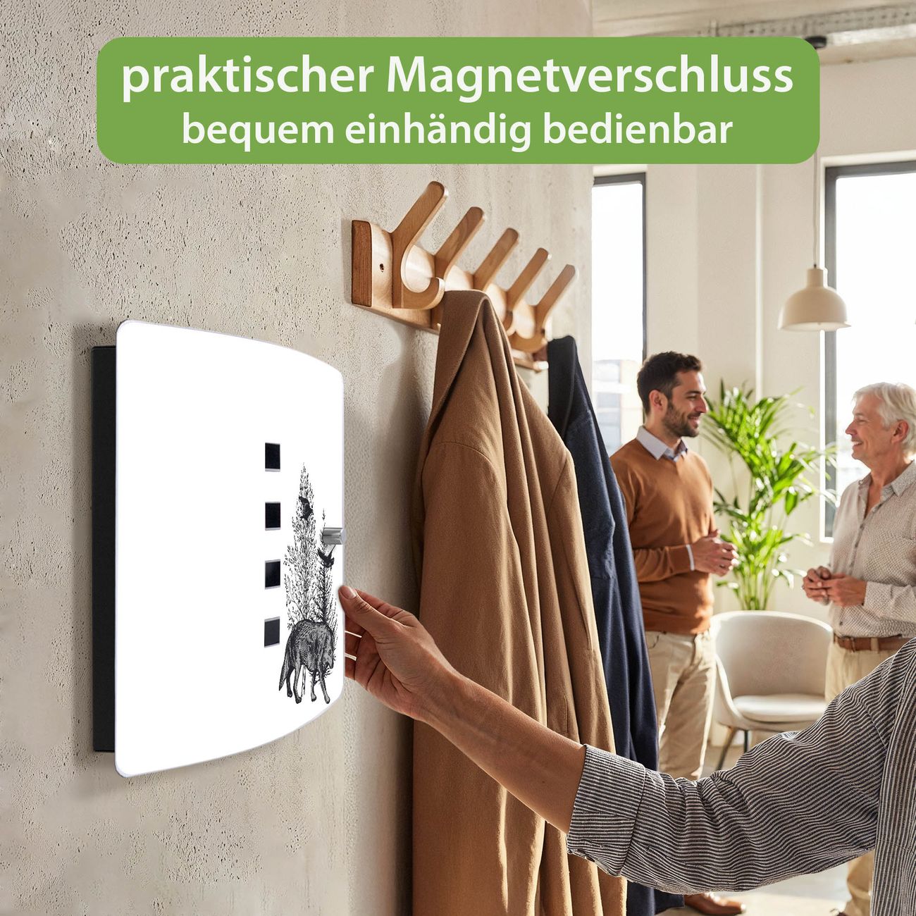 Funktion / Nutzen: Die leicht geschwungene Edelstahltür ist mit einer hochwertigen Motivfolie und dem Motiv Motiv Wolf in Schwarz-Weiß kaschiert. Ein praktischer Magnetverschluss ermöglicht Ihnen ein schnelles Öffnen und Schließen. Befestigt wird der Schlüsselkasten an 2 Stellen auf der Rückseite, passendes Montagematerial fügen wir bereits bei.