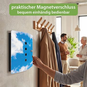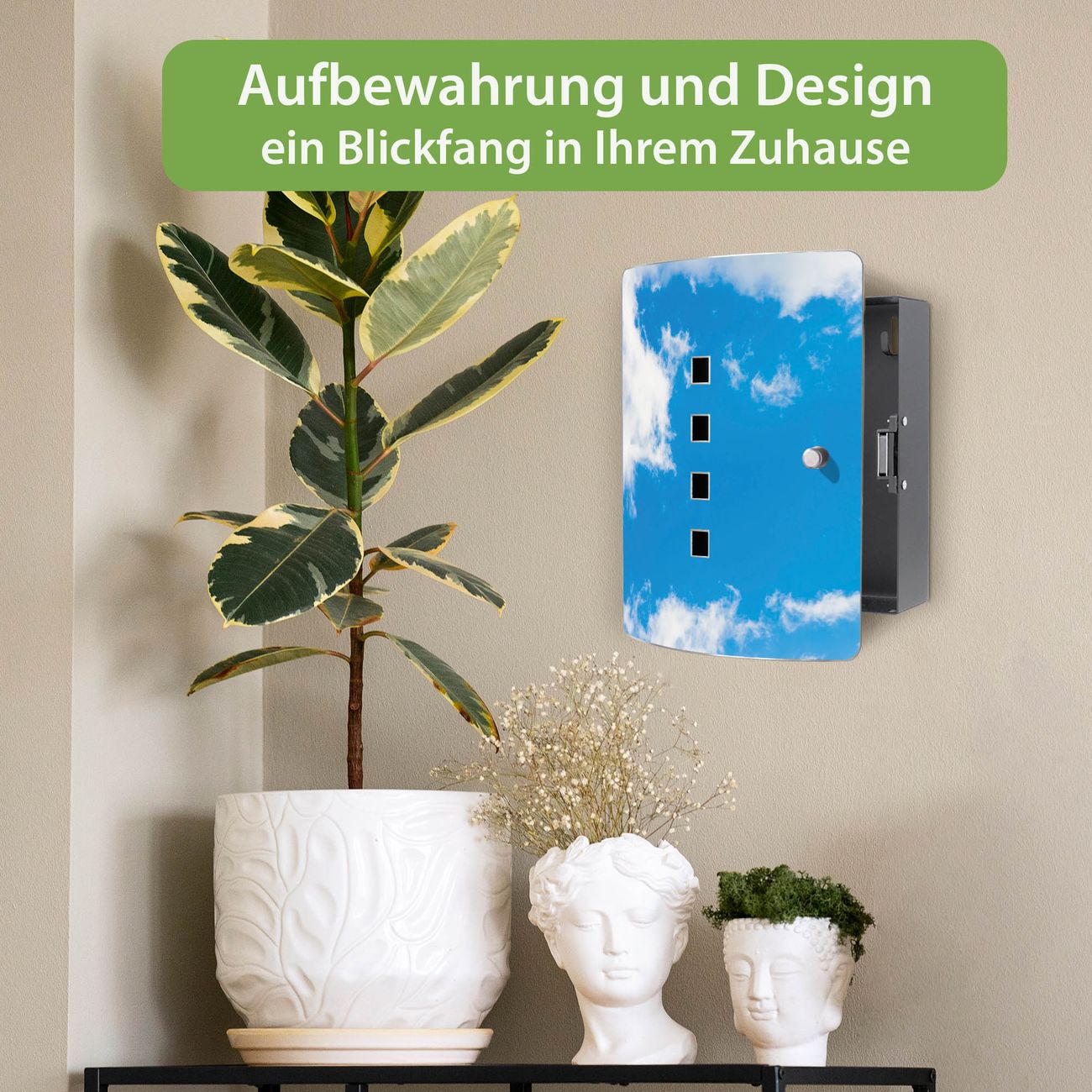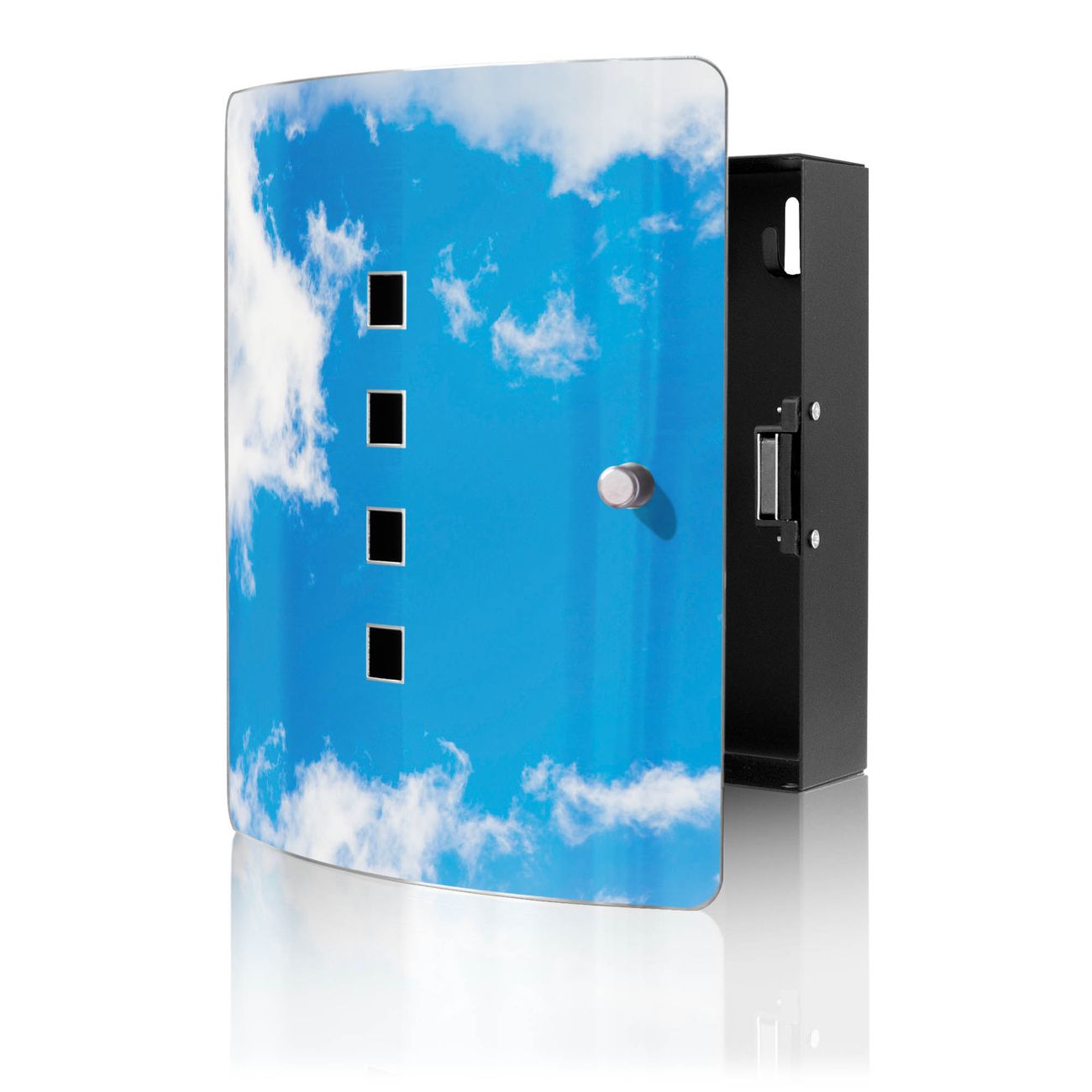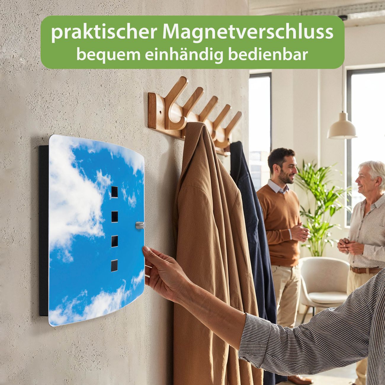 Funktion / Nutzen: Die leicht geschwungene Edelstahltür ist mit einer hochwertigen Motivfolie und dem Motiv Motiv Wolken 9 kaschiert. Ein praktischer Magnetverschluss ermöglicht Ihnen ein schnelles Öffnen und Schließen. Befestigt wird der Schlüsselkasten an 2 Stellen auf der Rückseite, passendes Montagematerial fügen wir bereits bei.