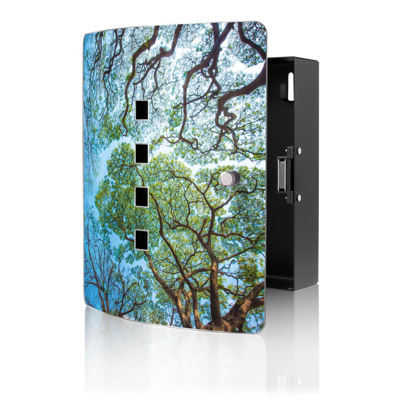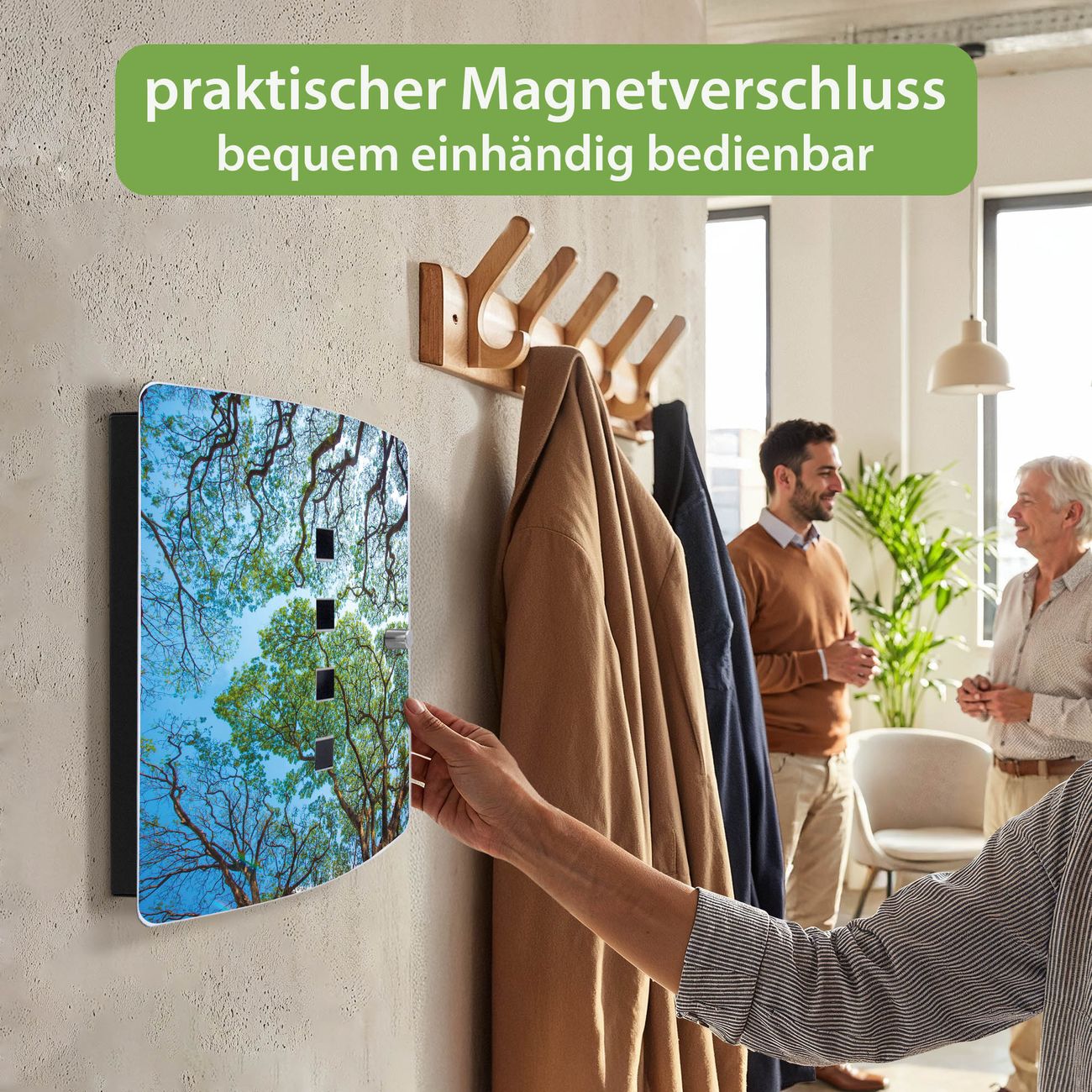 Funktion / Nutzen: Die leicht geschwungene Edelstahltür ist mit einer hochwertigen Motivfolie und dem Motiv Motiv Zwischen Bäumen 2 kaschiert. Ein praktischer Magnetverschluss ermöglicht Ihnen ein schnelles Öffnen und Schließen. Befestigt wird der Schlüsselkasten an 2 Stellen auf der Rückseite, passendes Montagematerial fügen wir bereits bei.
