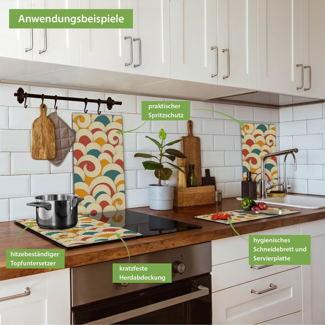 FUNKTION: Das banjado Schneidebrett mit Motiv Abstract Waves ist groß und rutschfest und damit ideal für Ihre Küche. Besonders praktisch. Das Schneidebrett ist vielseitig einsetzbar: ob als Spritzschutz hinter dem Herd für Ihre Küche oder als Glas Schneidebrett als hygienische und geruchsneutrale Unterlage. Sie können ebenfalls heiße Töpfe und Pfannen bis 100°C auf der Herdplattenabdeckung abstellen. Sie erhalten ein Multitalent für Ihre Küche. QUALITÄT: Die Schneideplatte Glas besteht aus hochwertigem, gehärtetem und hitzebeständigem Glas. Wählen Sie aus einem unserer zahlreichen Motive das passende Design für Ihre Küche aus. DETAILS: Das Schneidebrett Glas groß ist in verschiedenen Größen verfügbar. Sie erhalten separate Gumminoppen damit Ihr großes Schneidebrett rutschfest in der Küche steht. VIELSEITIG: Das Schneidebrett modern ist ein Allrounder - als Schneideunterlage Küche direkt auf dem Herd oder separat und als Spritzschutz an der Wand aufgestellt - ein praktisches Küchenutensil. BANJADO: Auf Wunsch fertigen wir das Glas Schneide Brett auch als Sondergröße an. Mehrteilige Platten sind auch möglich. Kontaktieren Sie uns gern für eine Spezialanfertigung Ihrer Glasplatte Küche.