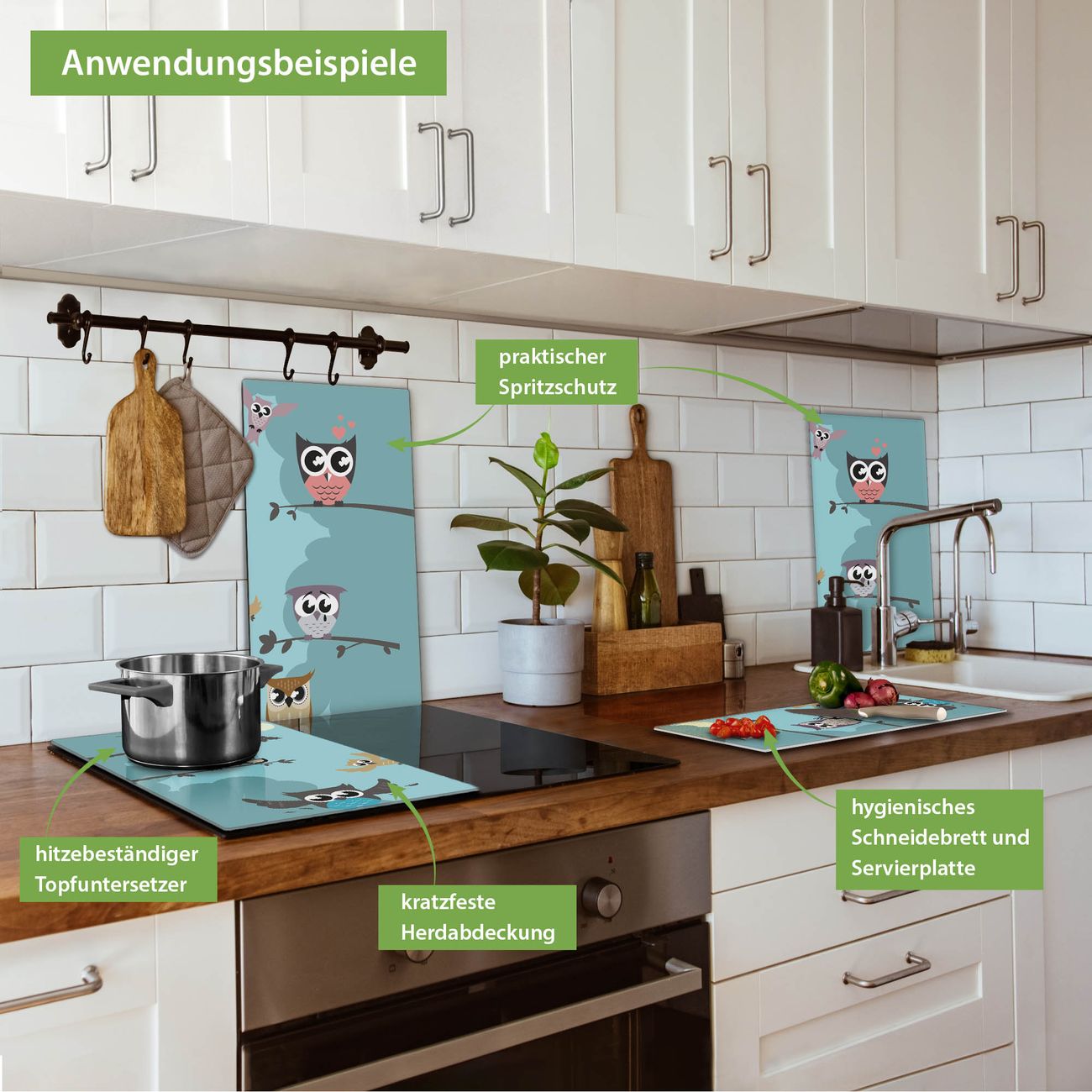 FUNKTION: Das banjado Schneidebrett mit Motiv Acht Eulen ist groß und rutschfest und damit ideal für Ihre Küche. Besonders praktisch. Das Schneidebrett ist vielseitig einsetzbar: ob als Spritzschutz hinter dem Herd für Ihre Küche oder als Glas Schneidebrett als hygienische und geruchsneutrale Unterlage. Sie können ebenfalls heiße Töpfe und Pfannen bis 100°C auf der Herdplattenabdeckung abstellen. Sie erhalten ein Multitalent für Ihre Küche. QUALITÄT: Die Schneideplatte Glas besteht aus hochwertigem, gehärtetem und hitzebeständigem Glas. Wählen Sie aus einem unserer zahlreichen Motive das passende Design für Ihre Küche aus. DETAILS: Das Schneidebrett Glas groß ist in verschiedenen Größen verfügbar. Sie erhalten separate Gumminoppen damit Ihr großes Schneidebrett rutschfest in der Küche steht. VIELSEITIG: Das Schneidebrett modern ist ein Allrounder - als Schneideunterlage Küche direkt auf dem Herd oder separat und als Spritzschutz an der Wand aufgestellt - ein praktisches Küchenutensil. BANJADO: Auf Wunsch fertigen wir das Glas Schneide Brett auch als Sondergröße an. Mehrteilige Platten sind auch möglich. Kontaktieren Sie uns gern für eine Spezialanfertigung Ihrer Glasplatte Küche.