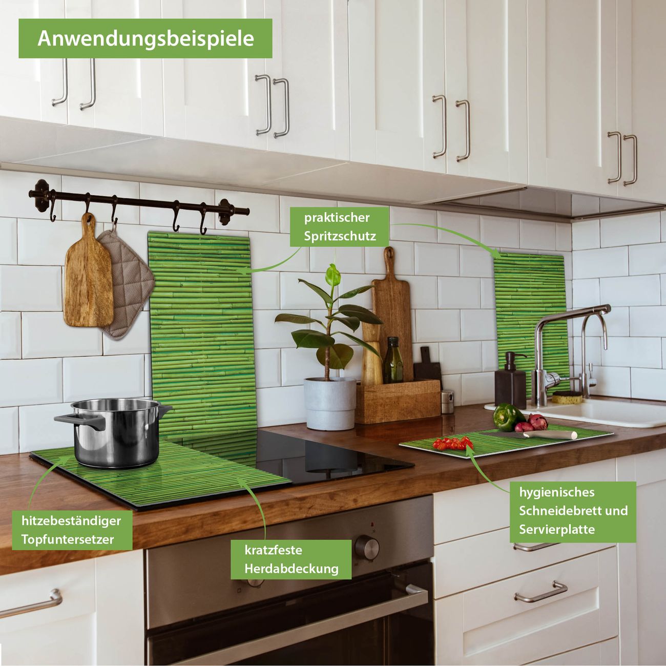 FUNKTION: Das banjado Schneidebrett mit Motiv Bambus Grün ist groß und rutschfest und damit ideal für Ihre Küche. Besonders praktisch. Das Schneidebrett ist vielseitig einsetzbar: ob als Spritzschutz hinter dem Herd für Ihre Küche oder als Glas Schneidebrett als hygienische und geruchsneutrale Unterlage. Sie können ebenfalls heiße Töpfe und Pfannen bis 100°C auf der Herdplattenabdeckung abstellen. Sie erhalten ein Multitalent für Ihre Küche. QUALITÄT: Die Schneideplatte Glas besteht aus hochwertigem, gehärtetem und hitzebeständigem Glas. Wählen Sie aus einem unserer zahlreichen Motive das passende Design für Ihre Küche aus. DETAILS: Das Schneidebrett Glas groß ist in verschiedenen Größen verfügbar. Sie erhalten separate Gumminoppen damit Ihr großes Schneidebrett rutschfest in der Küche steht. VIELSEITIG: Das Schneidebrett modern ist ein Allrounder - als Schneideunterlage Küche direkt auf dem Herd oder separat und als Spritzschutz an der Wand aufgestellt - ein praktisches Küchenutensil. BANJADO: Auf Wunsch fertigen wir das Glas Schneide Brett auch als Sondergröße an. Mehrteilige Platten sind auch möglich. Kontaktieren Sie uns gern für eine Spezialanfertigung Ihrer Glasplatte Küche.