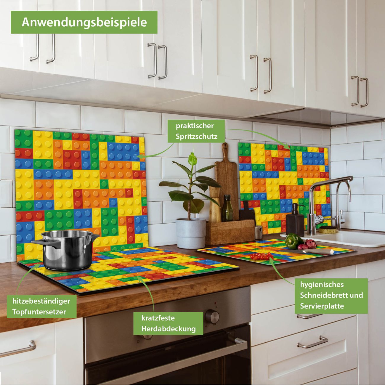 FUNKTION: Das banjado Schneidebrett mit Motiv Bausteine ist groß und rutschfest und damit ideal für Ihre Küche. Besonders praktisch. Das Schneidebrett ist vielseitig einsetzbar: ob als Spritzschutz hinter dem Herd für Ihre Küche oder als Glas Schneidebrett als hygienische und geruchsneutrale Unterlage. Sie können ebenfalls heiße Töpfe und Pfannen bis 100°C auf der Herdplattenabdeckung abstellen. Sie erhalten ein Multitalent für Ihre Küche. QUALITÄT: Die Schneideplatte Glas besteht aus hochwertigem, gehärtetem und hitzebeständigem Glas. Wählen Sie aus einem unserer zahlreichen Motive das passende Design für Ihre Küche aus. DETAILS: Das Schneidebrett Glas groß ist in verschiedenen Größen verfügbar. Sie erhalten separate Gumminoppen damit Ihr großes Schneidebrett rutschfest in der Küche steht. VIELSEITIG: Das Schneidebrett modern ist ein Allrounder - als Schneideunterlage Küche direkt auf dem Herd oder separat und als Spritzschutz an der Wand aufgestellt - ein praktisches Küchenutensil. BANJADO: Auf Wunsch fertigen wir das Glas Schneide Brett auch als Sondergröße an. Mehrteilige Platten sind auch möglich. Kontaktieren Sie uns gern für eine Spezialanfertigung Ihrer Glasplatte Küche.