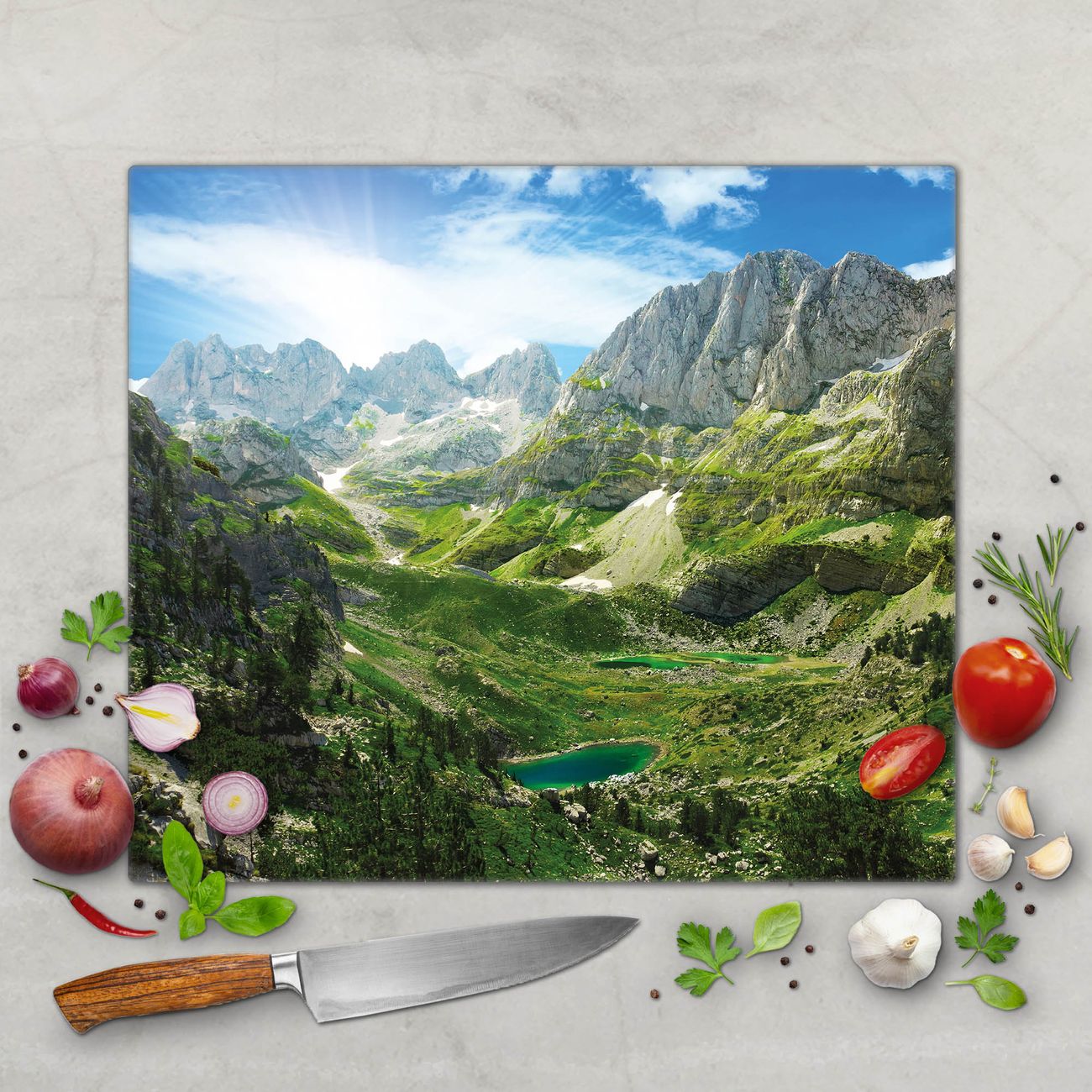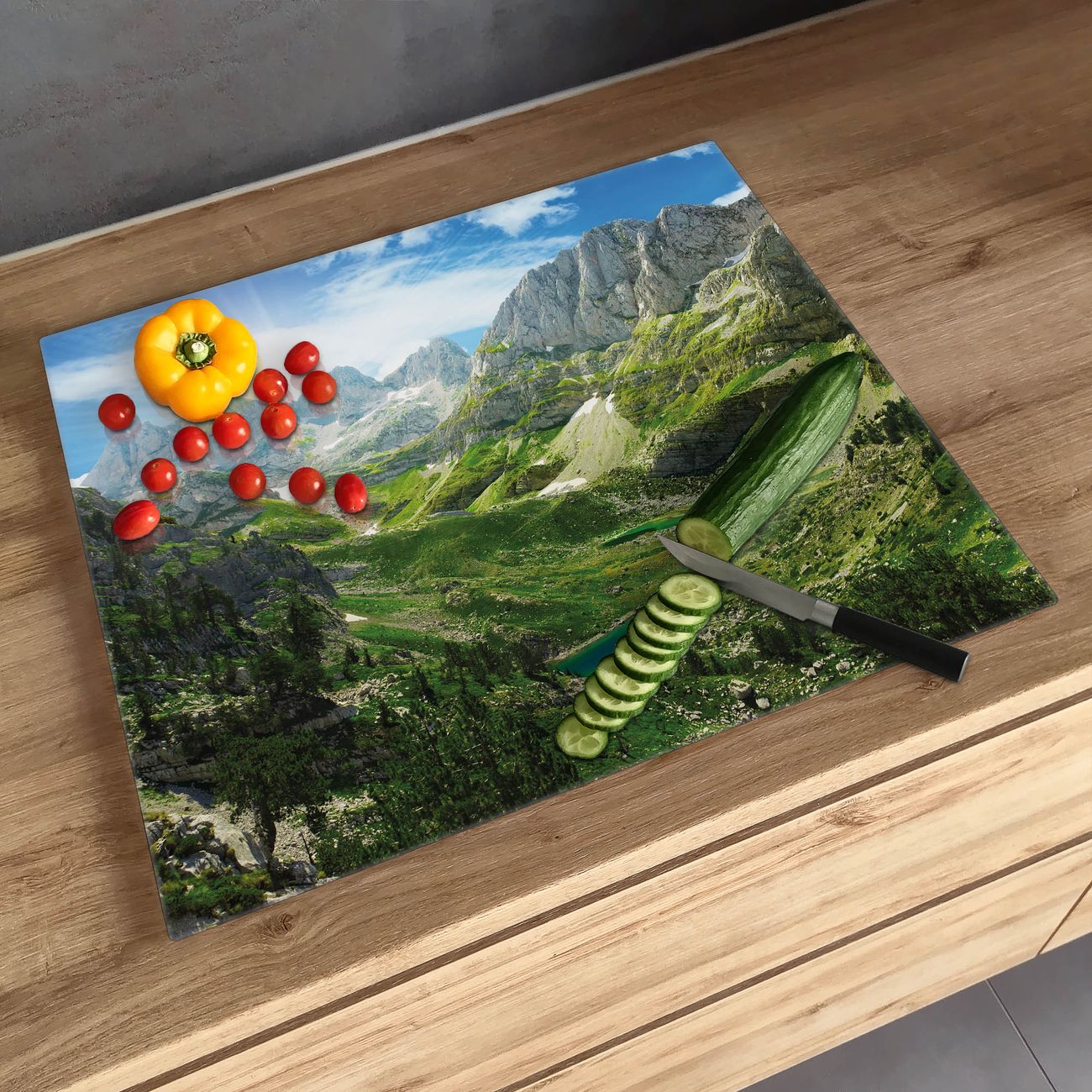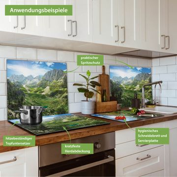 FUNKTION: Das banjado Schneidebrett mit Motiv Bergsee Alpen ist groß und rutschfest und damit ideal für Ihre Küche. Besonders praktisch. Das Schneidebrett ist vielseitig einsetzbar: ob als Spritzschutz hinter dem Herd für Ihre Küche oder als Glas Schneidebrett als hygienische und geruchsneutrale Unterlage. Sie können ebenfalls heiße Töpfe und Pfannen bis 100°C auf der Herdplattenabdeckung abstellen. Sie erhalten ein Multitalent für Ihre Küche. QUALITÄT: Die Schneideplatte Glas besteht aus hochwertigem, gehärtetem und hitzebeständigem Glas. Wählen Sie aus einem unserer zahlreichen Motive das passende Design für Ihre Küche aus. DETAILS: Das Schneidebrett Glas groß ist in verschiedenen Größen verfügbar. Sie erhalten separate Gumminoppen damit Ihr großes Schneidebrett rutschfest in der Küche steht. VIELSEITIG: Das Schneidebrett modern ist ein Allrounder - als Schneideunterlage Küche direkt auf dem Herd oder separat und als Spritzschutz an der Wand aufgestellt - ein praktisches Küchenutensil. BANJADO: Auf Wunsch fertigen wir das Glas Schneide Brett auch als Sondergröße an. Mehrteilige Platten sind auch möglich. Kontaktieren Sie uns gern für eine Spezialanfertigung Ihrer Glasplatte Küche.