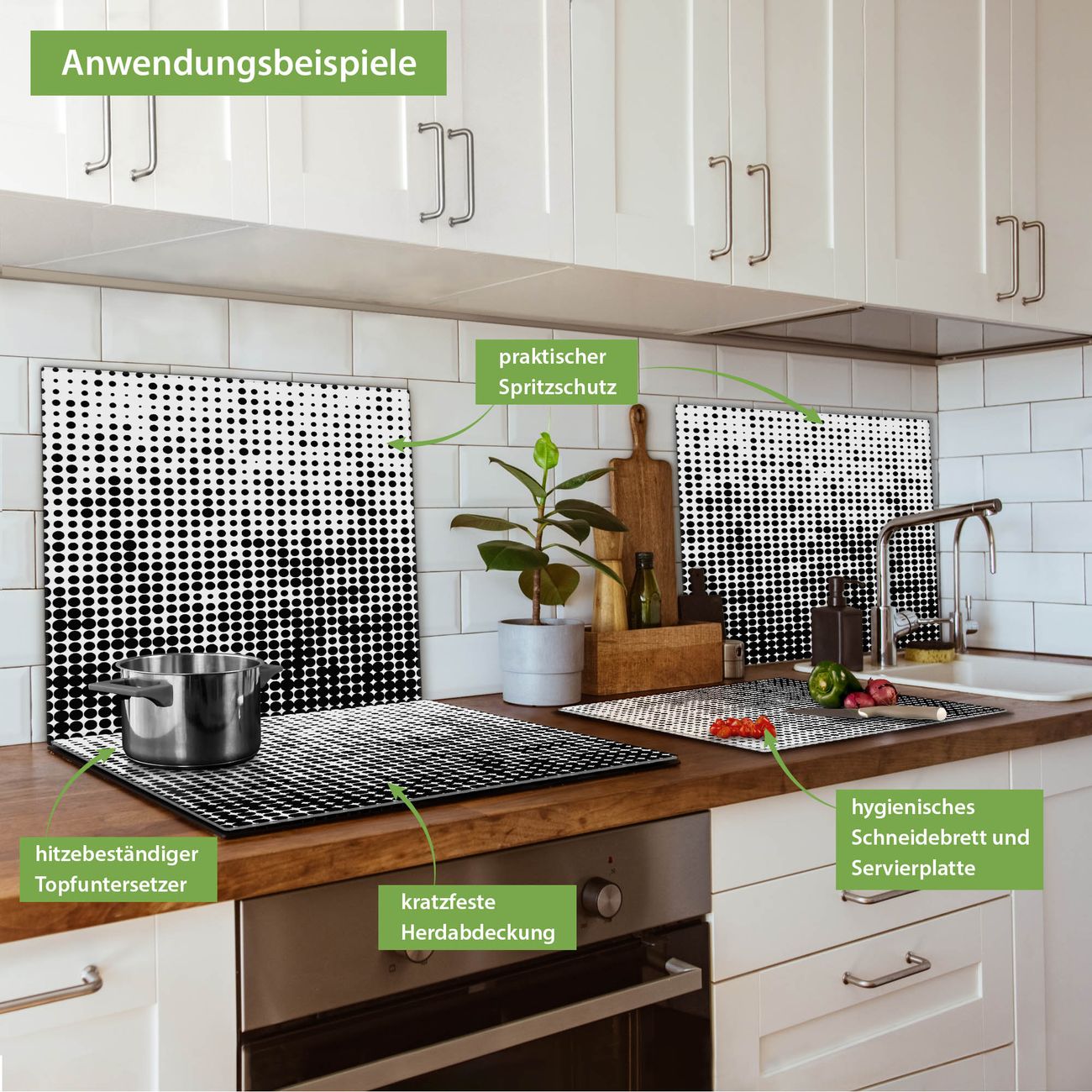 FUNKTION: Das banjado Schneidebrett mit Motiv Black or White ist groß und rutschfest und damit ideal für Ihre Küche. Besonders praktisch. Das Schneidebrett ist vielseitig einsetzbar: ob als Spritzschutz hinter dem Herd für Ihre Küche oder als Glas Schneidebrett als hygienische und geruchsneutrale Unterlage. Sie können ebenfalls heiße Töpfe und Pfannen bis 100°C auf der Herdplattenabdeckung abstellen. Sie erhalten ein Multitalent für Ihre Küche. QUALITÄT: Die Schneideplatte Glas besteht aus hochwertigem, gehärtetem und hitzebeständigem Glas. Wählen Sie aus einem unserer zahlreichen Motive das passende Design für Ihre Küche aus. DETAILS: Das Schneidebrett Glas groß ist in verschiedenen Größen verfügbar. Sie erhalten separate Gumminoppen damit Ihr großes Schneidebrett rutschfest in der Küche steht. VIELSEITIG: Das Schneidebrett modern ist ein Allrounder - als Schneideunterlage Küche direkt auf dem Herd oder separat und als Spritzschutz an der Wand aufgestellt - ein praktisches Küchenutensil. BANJADO: Auf Wunsch fertigen wir das Glas Schneide Brett auch als Sondergröße an. Mehrteilige Platten sind auch möglich. Kontaktieren Sie uns gern für eine Spezialanfertigung Ihrer Glasplatte Küche.