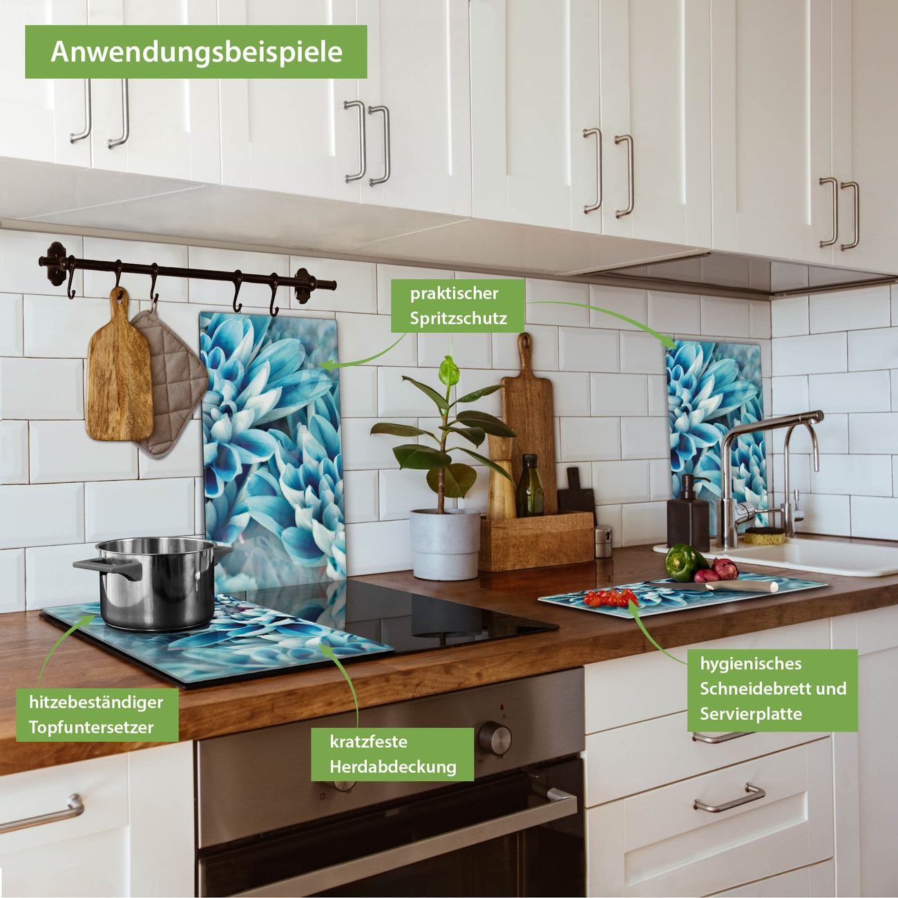 FUNKTION: Das banjado Schneidebrett mit Motiv Blaue Blüten ist groß und rutschfest und damit ideal für Ihre Küche. Besonders praktisch. Das Schneidebrett ist vielseitig einsetzbar: ob als Spritzschutz hinter dem Herd für Ihre Küche oder als Glas Schneidebrett als hygienische und geruchsneutrale Unterlage. Sie können ebenfalls heiße Töpfe und Pfannen bis 100°C auf der Herdplattenabdeckung abstellen. Sie erhalten ein Multitalent für Ihre Küche. QUALITÄT: Die Schneideplatte Glas besteht aus hochwertigem, gehärtetem und hitzebeständigem Glas. Wählen Sie aus einem unserer zahlreichen Motive das passende Design für Ihre Küche aus. DETAILS: Das Schneidebrett Glas groß ist in verschiedenen Größen verfügbar. Sie erhalten separate Gumminoppen damit Ihr großes Schneidebrett rutschfest in der Küche steht. VIELSEITIG: Das Schneidebrett modern ist ein Allrounder - als Schneideunterlage Küche direkt auf dem Herd oder separat und als Spritzschutz an der Wand aufgestellt - ein praktisches Küchenutensil. BANJADO: Auf Wunsch fertigen wir das Glas Schneide Brett auch als Sondergröße an. Mehrteilige Platten sind auch möglich. Kontaktieren Sie uns gern für eine Spezialanfertigung Ihrer Glasplatte Küche.