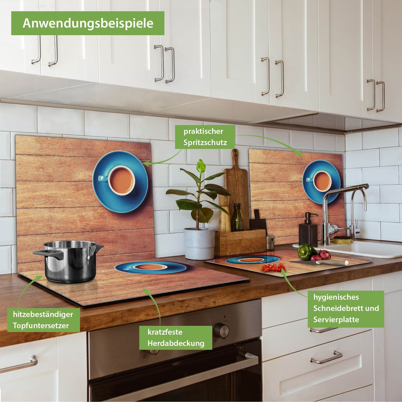 FUNKTION: Das banjado Schneidebrett mit Motiv Blaue Tasse ist groß und rutschfest und damit ideal für Ihre Küche. Besonders praktisch. Das Schneidebrett ist vielseitig einsetzbar: ob als Spritzschutz hinter dem Herd für Ihre Küche oder als Glas Schneidebrett als hygienische und geruchsneutrale Unterlage. Sie können ebenfalls heiße Töpfe und Pfannen bis 100°C auf der Herdplattenabdeckung abstellen. Sie erhalten ein Multitalent für Ihre Küche. QUALITÄT: Die Schneideplatte Glas besteht aus hochwertigem, gehärtetem und hitzebeständigem Glas. Wählen Sie aus einem unserer zahlreichen Motive das passende Design für Ihre Küche aus. DETAILS: Das Schneidebrett Glas groß ist in verschiedenen Größen verfügbar. Sie erhalten separate Gumminoppen damit Ihr großes Schneidebrett rutschfest in der Küche steht. VIELSEITIG: Das Schneidebrett modern ist ein Allrounder - als Schneideunterlage Küche direkt auf dem Herd oder separat und als Spritzschutz an der Wand aufgestellt - ein praktisches Küchenutensil. BANJADO: Auf Wunsch fertigen wir das Glas Schneide Brett auch als Sondergröße an. Mehrteilige Platten sind auch möglich. Kontaktieren Sie uns gern für eine Spezialanfertigung Ihrer Glasplatte Küche.