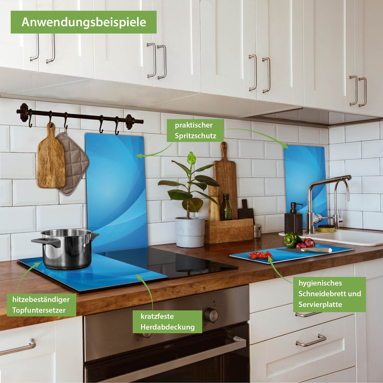 FUNKTION: Das banjado Schneidebrett mit Motiv Blaues Licht ist groß und rutschfest und damit ideal für Ihre Küche. Besonders praktisch. Das Schneidebrett ist vielseitig einsetzbar: ob als Spritzschutz hinter dem Herd für Ihre Küche oder als Glas Schneidebrett als hygienische und geruchsneutrale Unterlage. Sie können ebenfalls heiße Töpfe und Pfannen bis 100°C auf der Herdplattenabdeckung abstellen. Sie erhalten ein Multitalent für Ihre Küche. QUALITÄT: Die Schneideplatte Glas besteht aus hochwertigem, gehärtetem und hitzebeständigem Glas. Wählen Sie aus einem unserer zahlreichen Motive das passende Design für Ihre Küche aus. DETAILS: Das Schneidebrett Glas groß ist in verschiedenen Größen verfügbar. Sie erhalten separate Gumminoppen damit Ihr großes Schneidebrett rutschfest in der Küche steht. VIELSEITIG: Das Schneidebrett modern ist ein Allrounder - als Schneideunterlage Küche direkt auf dem Herd oder separat und als Spritzschutz an der Wand aufgestellt - ein praktisches Küchenutensil. BANJADO: Auf Wunsch fertigen wir das Glas Schneide Brett auch als Sondergröße an. Mehrteilige Platten sind auch möglich. Kontaktieren Sie uns gern für eine Spezialanfertigung Ihrer Glasplatte Küche.