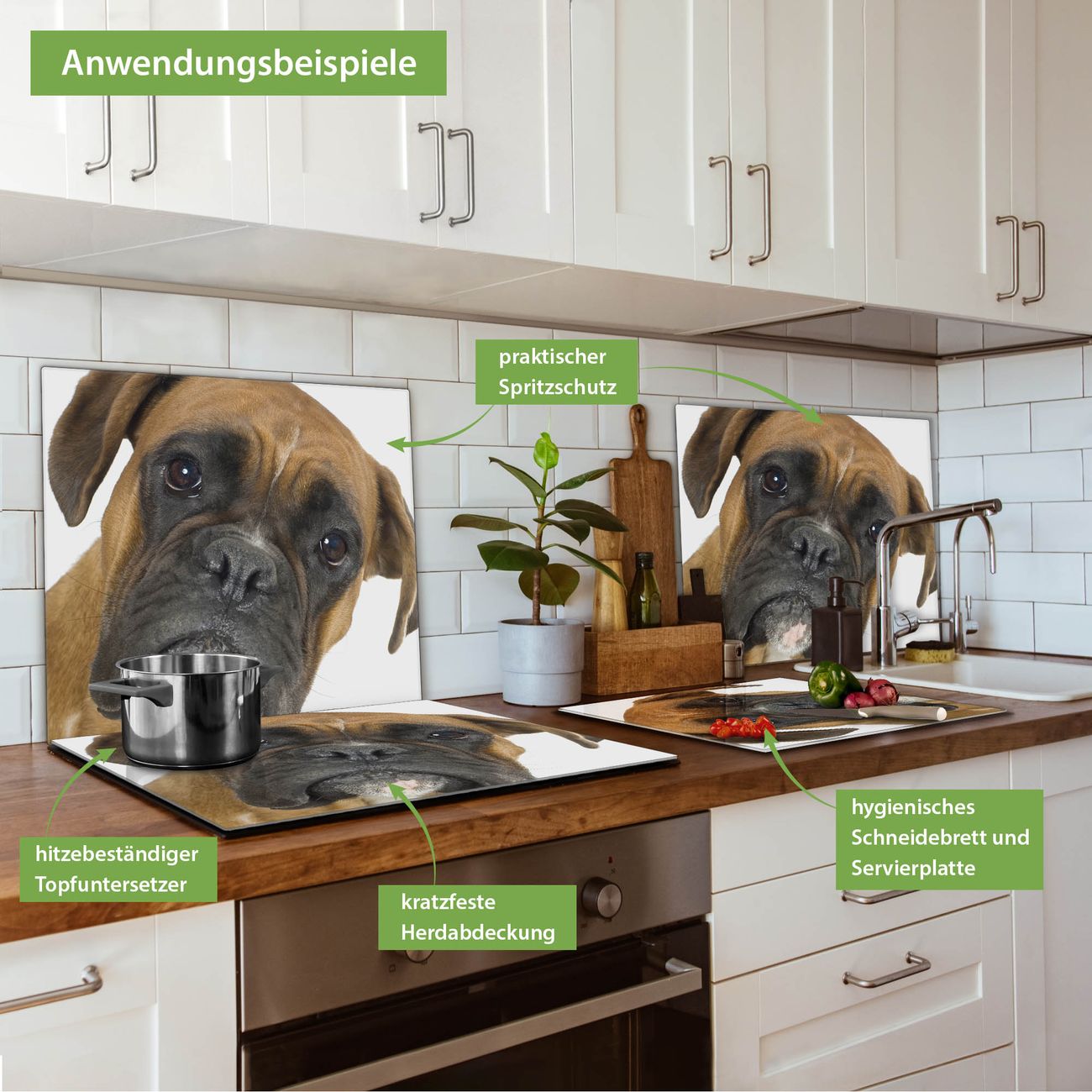 FUNKTION: Das banjado Schneidebrett mit Motiv Boxer ist groß und rutschfest und damit ideal für Ihre Küche. Besonders praktisch. Das Schneidebrett ist vielseitig einsetzbar: ob als Spritzschutz hinter dem Herd für Ihre Küche oder als Glas Schneidebrett als hygienische und geruchsneutrale Unterlage. Sie können ebenfalls heiße Töpfe und Pfannen bis 100°C auf der Herdplattenabdeckung abstellen. Sie erhalten ein Multitalent für Ihre Küche. QUALITÄT: Die Schneideplatte Glas besteht aus hochwertigem, gehärtetem und hitzebeständigem Glas. Wählen Sie aus einem unserer zahlreichen Motive das passende Design für Ihre Küche aus. DETAILS: Das Schneidebrett Glas groß ist in verschiedenen Größen verfügbar. Sie erhalten separate Gumminoppen damit Ihr großes Schneidebrett rutschfest in der Küche steht. VIELSEITIG: Das Schneidebrett modern ist ein Allrounder - als Schneideunterlage Küche direkt auf dem Herd oder separat und als Spritzschutz an der Wand aufgestellt - ein praktisches Küchenutensil. BANJADO: Auf Wunsch fertigen wir das Glas Schneide Brett auch als Sondergröße an. Mehrteilige Platten sind auch möglich. Kontaktieren Sie uns gern für eine Spezialanfertigung Ihrer Glasplatte Küche.