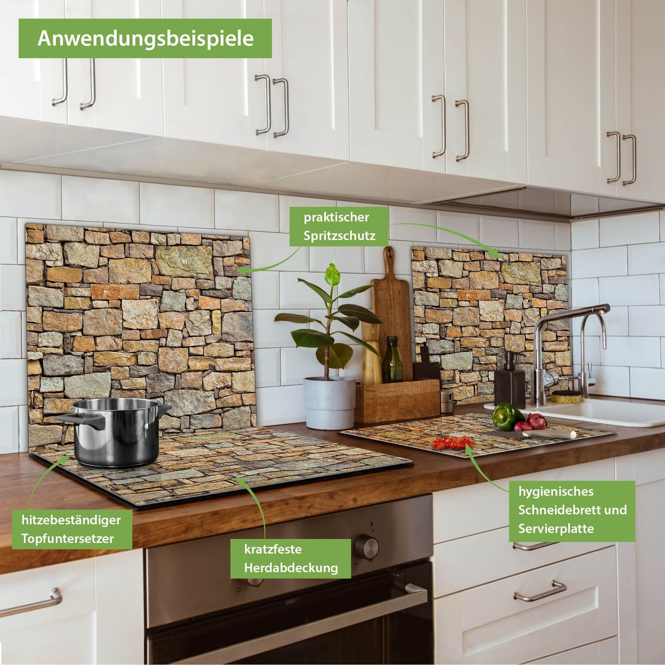 FUNKTION: Das banjado Schneidebrett mit Motiv Bruchsteinmauer ist groß und rutschfest und damit ideal für Ihre Küche. Besonders praktisch. Das Schneidebrett ist vielseitig einsetzbar: ob als Spritzschutz hinter dem Herd für Ihre Küche oder als Glas Schneidebrett als hygienische und geruchsneutrale Unterlage. Sie können ebenfalls heiße Töpfe und Pfannen bis 100°C auf der Herdplattenabdeckung abstellen. Sie erhalten ein Multitalent für Ihre Küche. QUALITÄT: Die Schneideplatte Glas besteht aus hochwertigem, gehärtetem und hitzebeständigem Glas. Wählen Sie aus einem unserer zahlreichen Motive das passende Design für Ihre Küche aus. DETAILS: Das Schneidebrett Glas groß ist in verschiedenen Größen verfügbar. Sie erhalten separate Gumminoppen damit Ihr großes Schneidebrett rutschfest in der Küche steht. VIELSEITIG: Das Schneidebrett modern ist ein Allrounder - als Schneideunterlage Küche direkt auf dem Herd oder separat und als Spritzschutz an der Wand aufgestellt - ein praktisches Küchenutensil. BANJADO: Auf Wunsch fertigen wir das Glas Schneide Brett auch als Sondergröße an. Mehrteilige Platten sind auch möglich. Kontaktieren Sie uns gern für eine Spezialanfertigung Ihrer Glasplatte Küche.