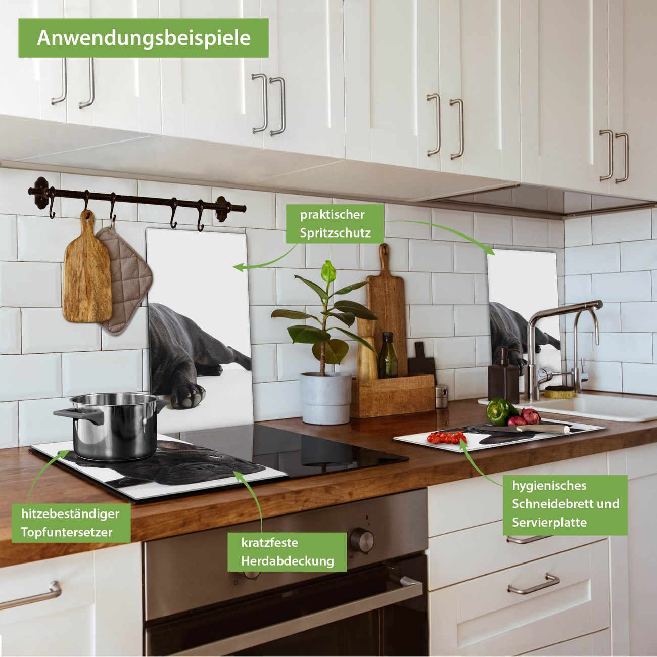FUNKTION: Das banjado Schneidebrett mit Motiv Bulldogge ist groß und rutschfest und damit ideal für Ihre Küche. Besonders praktisch. Das Schneidebrett ist vielseitig einsetzbar: ob als Spritzschutz hinter dem Herd für Ihre Küche oder als Glas Schneidebrett als hygienische und geruchsneutrale Unterlage. Sie können ebenfalls heiße Töpfe und Pfannen bis 100°C auf der Herdplattenabdeckung abstellen. Sie erhalten ein Multitalent für Ihre Küche. QUALITÄT: Die Schneideplatte Glas besteht aus hochwertigem, gehärtetem und hitzebeständigem Glas. Wählen Sie aus einem unserer zahlreichen Motive das passende Design für Ihre Küche aus. DETAILS: Das Schneidebrett Glas groß ist in verschiedenen Größen verfügbar. Sie erhalten separate Gumminoppen damit Ihr großes Schneidebrett rutschfest in der Küche steht. VIELSEITIG: Das Schneidebrett modern ist ein Allrounder - als Schneideunterlage Küche direkt auf dem Herd oder separat und als Spritzschutz an der Wand aufgestellt - ein praktisches Küchenutensil. BANJADO: Auf Wunsch fertigen wir das Glas Schneide Brett auch als Sondergröße an. Mehrteilige Platten sind auch möglich. Kontaktieren Sie uns gern für eine Spezialanfertigung Ihrer Glasplatte Küche.