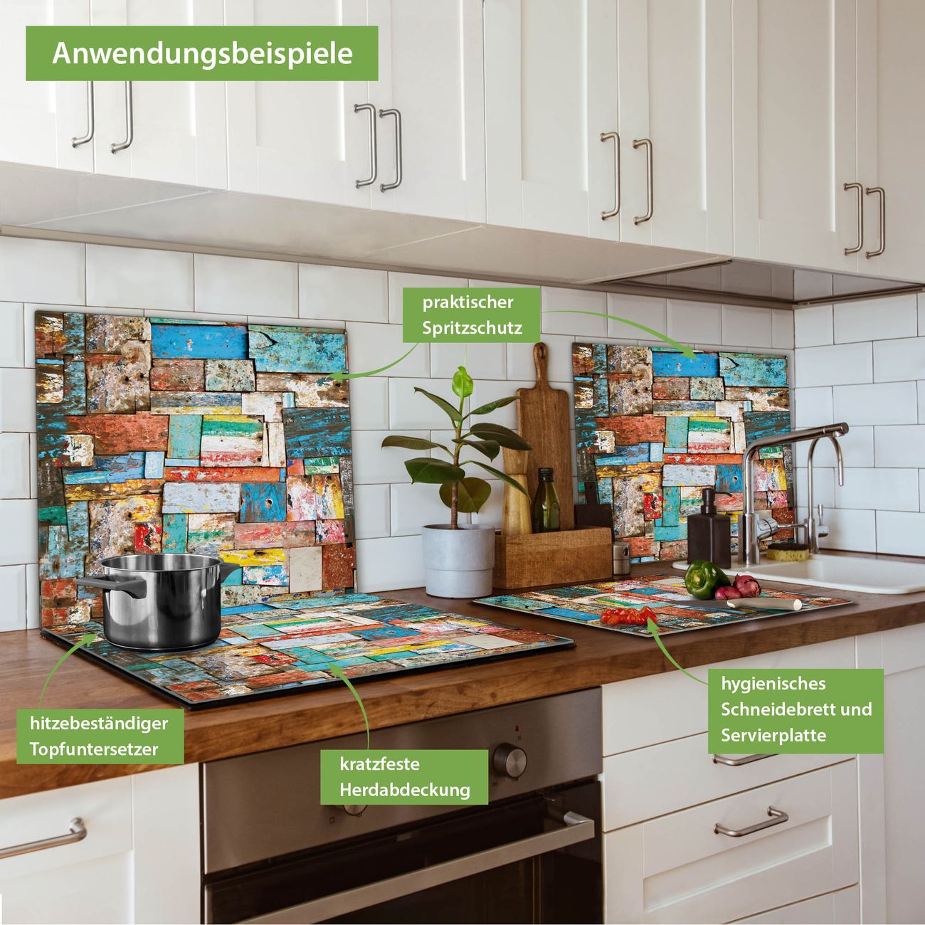 FUNKTION: Das banjado Schneidebrett mit Motiv Bunte Holzschindeln ist groß und rutschfest und damit ideal für Ihre Küche. Besonders praktisch. Das Schneidebrett ist vielseitig einsetzbar: ob als Spritzschutz hinter dem Herd für Ihre Küche oder als Glas Schneidebrett als hygienische und geruchsneutrale Unterlage. Sie können ebenfalls heiße Töpfe und Pfannen bis 100°C auf der Herdplattenabdeckung abstellen. Sie erhalten ein Multitalent für Ihre Küche. QUALITÄT: Die Schneideplatte Glas besteht aus hochwertigem, gehärtetem und hitzebeständigem Glas. Wählen Sie aus einem unserer zahlreichen Motive das passende Design für Ihre Küche aus. DETAILS: Das Schneidebrett Glas groß ist in verschiedenen Größen verfügbar. Sie erhalten separate Gumminoppen damit Ihr großes Schneidebrett rutschfest in der Küche steht. VIELSEITIG: Das Schneidebrett modern ist ein Allrounder - als Schneideunterlage Küche direkt auf dem Herd oder separat und als Spritzschutz an der Wand aufgestellt - ein praktisches Küchenutensil. BANJADO: Auf Wunsch fertigen wir das Glas Schneide Brett auch als Sondergröße an. Mehrteilige Platten sind auch möglich. Kontaktieren Sie uns gern für eine Spezialanfertigung Ihrer Glasplatte Küche.