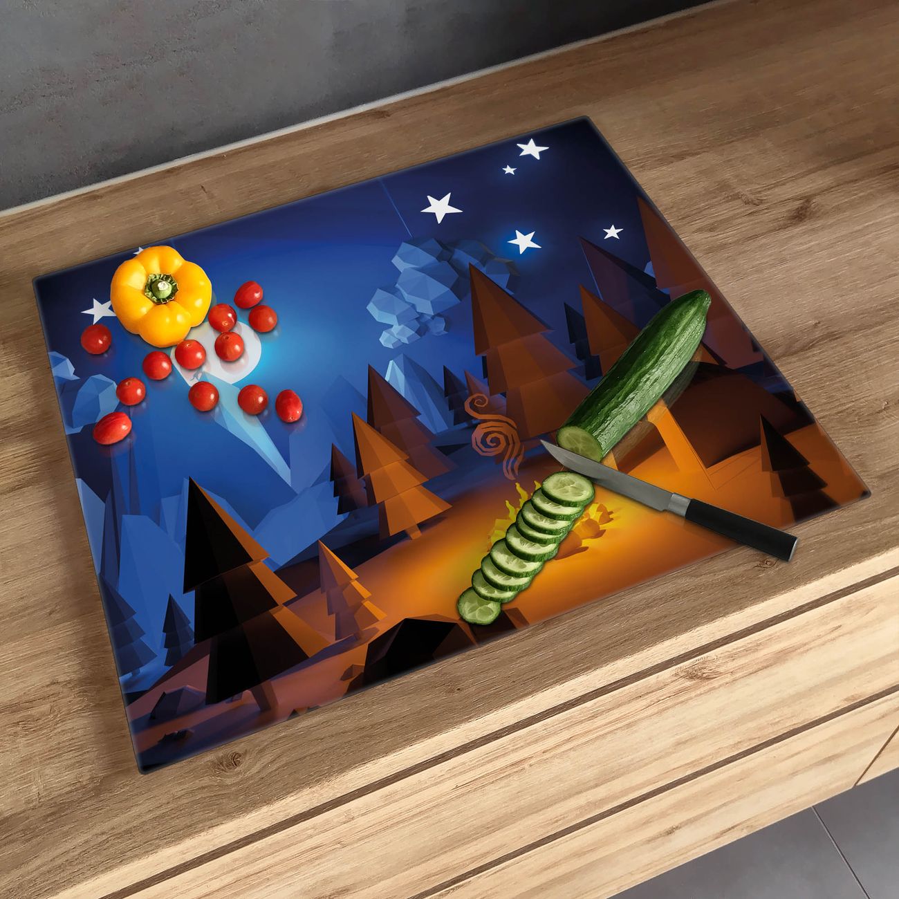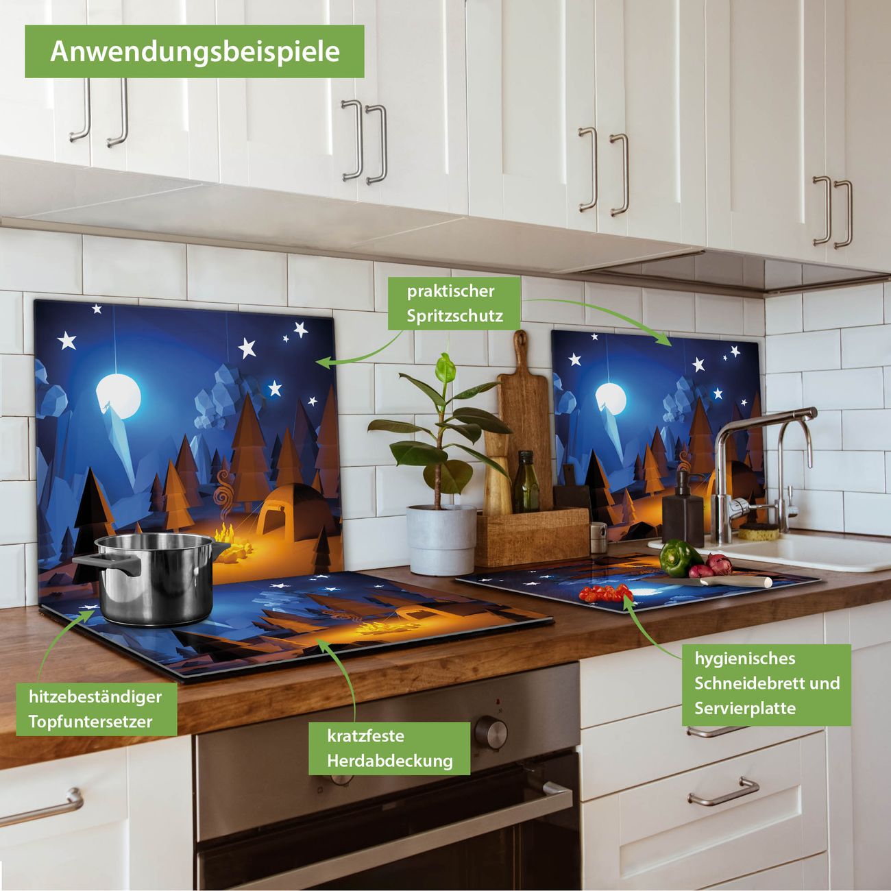 FUNKTION: Das banjado Schneidebrett mit Motiv Camping 2 ist groß und rutschfest und damit ideal für Ihre Küche. Besonders praktisch. Das Schneidebrett ist vielseitig einsetzbar: ob als Spritzschutz hinter dem Herd für Ihre Küche oder als Glas Schneidebrett als hygienische und geruchsneutrale Unterlage. Sie können ebenfalls heiße Töpfe und Pfannen bis 100°C auf der Herdplattenabdeckung abstellen. Sie erhalten ein Multitalent für Ihre Küche. QUALITÄT: Die Schneideplatte Glas besteht aus hochwertigem, gehärtetem und hitzebeständigem Glas. Wählen Sie aus einem unserer zahlreichen Motive das passende Design für Ihre Küche aus. DETAILS: Das Schneidebrett Glas groß ist in verschiedenen Größen verfügbar. Sie erhalten separate Gumminoppen damit Ihr großes Schneidebrett rutschfest in der Küche steht. VIELSEITIG: Das Schneidebrett modern ist ein Allrounder - als Schneideunterlage Küche direkt auf dem Herd oder separat und als Spritzschutz an der Wand aufgestellt - ein praktisches Küchenutensil. BANJADO: Auf Wunsch fertigen wir das Glas Schneide Brett auch als Sondergröße an. Mehrteilige Platten sind auch möglich. Kontaktieren Sie uns gern für eine Spezialanfertigung Ihrer Glasplatte Küche.