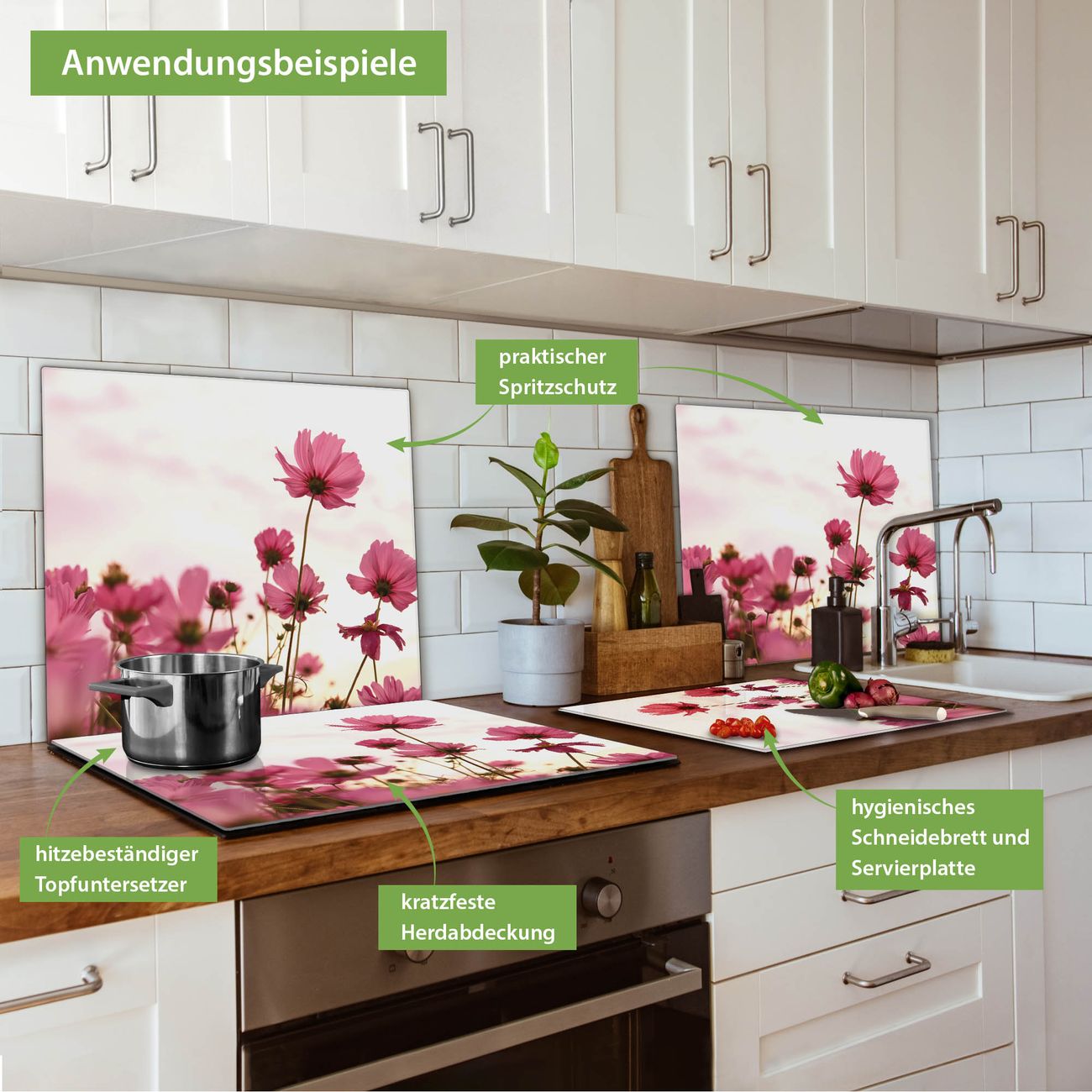 FUNKTION: Das banjado Schneidebrett mit Motiv Cosmea ist groß und rutschfest und damit ideal für Ihre Küche. Besonders praktisch. Das Schneidebrett ist vielseitig einsetzbar: ob als Spritzschutz hinter dem Herd für Ihre Küche oder als Glas Schneidebrett als hygienische und geruchsneutrale Unterlage. Sie können ebenfalls heiße Töpfe und Pfannen bis 100°C auf der Herdplattenabdeckung abstellen. Sie erhalten ein Multitalent für Ihre Küche. QUALITÄT: Die Schneideplatte Glas besteht aus hochwertigem, gehärtetem und hitzebeständigem Glas. Wählen Sie aus einem unserer zahlreichen Motive das passende Design für Ihre Küche aus. DETAILS: Das Schneidebrett Glas groß ist in verschiedenen Größen verfügbar. Sie erhalten separate Gumminoppen damit Ihr großes Schneidebrett rutschfest in der Küche steht. VIELSEITIG: Das Schneidebrett modern ist ein Allrounder - als Schneideunterlage Küche direkt auf dem Herd oder separat und als Spritzschutz an der Wand aufgestellt - ein praktisches Küchenutensil. BANJADO: Auf Wunsch fertigen wir das Glas Schneide Brett auch als Sondergröße an. Mehrteilige Platten sind auch möglich. Kontaktieren Sie uns gern für eine Spezialanfertigung Ihrer Glasplatte Küche.