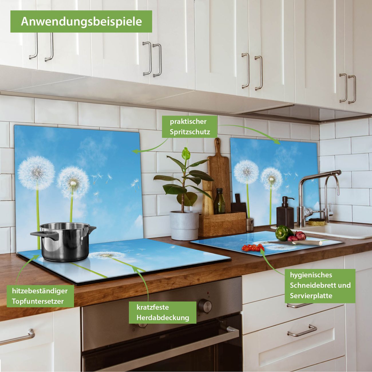 FUNKTION: Das banjado Schneidebrett mit Motiv Dandelion ist groß und rutschfest und damit ideal für Ihre Küche. Besonders praktisch. Das Schneidebrett ist vielseitig einsetzbar: ob als Spritzschutz hinter dem Herd für Ihre Küche oder als Glas Schneidebrett als hygienische und geruchsneutrale Unterlage. Sie können ebenfalls heiße Töpfe und Pfannen bis 100°C auf der Herdplattenabdeckung abstellen. Sie erhalten ein Multitalent für Ihre Küche. QUALITÄT: Die Schneideplatte Glas besteht aus hochwertigem, gehärtetem und hitzebeständigem Glas. Wählen Sie aus einem unserer zahlreichen Motive das passende Design für Ihre Küche aus. DETAILS: Das Schneidebrett Glas groß ist in verschiedenen Größen verfügbar. Sie erhalten separate Gumminoppen damit Ihr großes Schneidebrett rutschfest in der Küche steht. VIELSEITIG: Das Schneidebrett modern ist ein Allrounder - als Schneideunterlage Küche direkt auf dem Herd oder separat und als Spritzschutz an der Wand aufgestellt - ein praktisches Küchenutensil. BANJADO: Auf Wunsch fertigen wir das Glas Schneide Brett auch als Sondergröße an. Mehrteilige Platten sind auch möglich. Kontaktieren Sie uns gern für eine Spezialanfertigung Ihrer Glasplatte Küche.