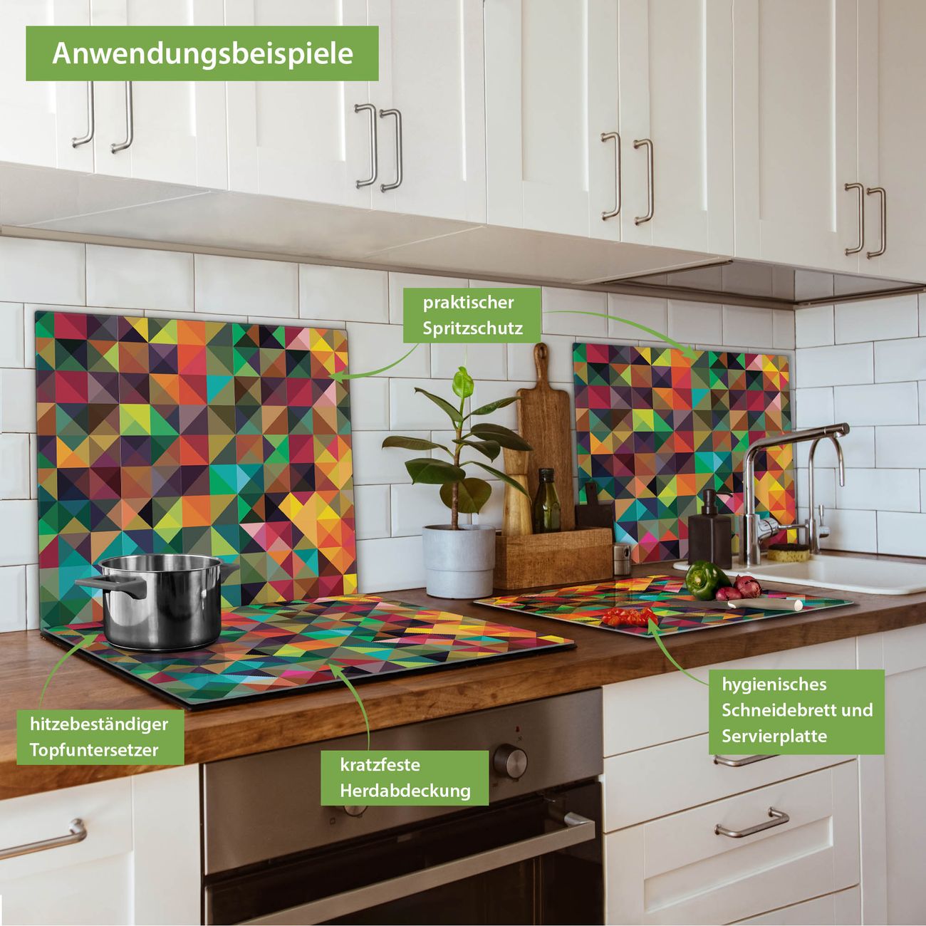 FUNKTION: Das banjado Schneidebrett mit Motiv Dunkles Kaleidoskop ist groß und rutschfest und damit ideal für Ihre Küche. Besonders praktisch. Das Schneidebrett ist vielseitig einsetzbar: ob als Spritzschutz hinter dem Herd für Ihre Küche oder als Glas Schneidebrett als hygienische und geruchsneutrale Unterlage. Sie können ebenfalls heiße Töpfe und Pfannen bis 100°C auf der Herdplattenabdeckung abstellen. Sie erhalten ein Multitalent für Ihre Küche. QUALITÄT: Die Schneideplatte Glas besteht aus hochwertigem, gehärtetem und hitzebeständigem Glas. Wählen Sie aus einem unserer zahlreichen Motive das passende Design für Ihre Küche aus. DETAILS: Das Schneidebrett Glas groß ist in verschiedenen Größen verfügbar. Sie erhalten separate Gumminoppen damit Ihr großes Schneidebrett rutschfest in der Küche steht. VIELSEITIG: Das Schneidebrett modern ist ein Allrounder - als Schneideunterlage Küche direkt auf dem Herd oder separat und als Spritzschutz an der Wand aufgestellt - ein praktisches Küchenutensil. BANJADO: Auf Wunsch fertigen wir das Glas Schneide Brett auch als Sondergröße an. Mehrteilige Platten sind auch möglich. Kontaktieren Sie uns gern für eine Spezialanfertigung Ihrer Glasplatte Küche.