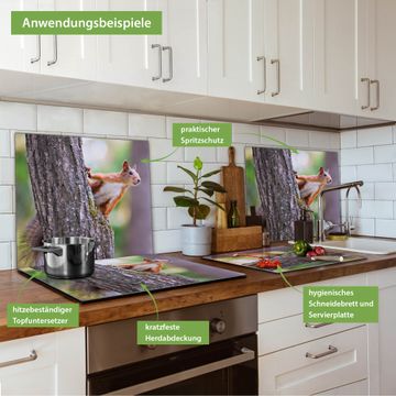 FUNKTION: Das banjado Schneidebrett mit Motiv Eichhörnchen ist groß und rutschfest und damit ideal für Ihre Küche. Besonders praktisch. Das Schneidebrett ist vielseitig einsetzbar: ob als Spritzschutz hinter dem Herd für Ihre Küche oder als Glas Schneidebrett als hygienische und geruchsneutrale Unterlage. Sie können ebenfalls heiße Töpfe und Pfannen bis 100°C auf der Herdplattenabdeckung abstellen. Sie erhalten ein Multitalent für Ihre Küche. QUALITÄT: Die Schneideplatte Glas besteht aus hochwertigem, gehärtetem und hitzebeständigem Glas. Wählen Sie aus einem unserer zahlreichen Motive das passende Design für Ihre Küche aus. DETAILS: Das Schneidebrett Glas groß ist in verschiedenen Größen verfügbar. Sie erhalten separate Gumminoppen damit Ihr großes Schneidebrett rutschfest in der Küche steht. VIELSEITIG: Das Schneidebrett modern ist ein Allrounder - als Schneideunterlage Küche direkt auf dem Herd oder separat und als Spritzschutz an der Wand aufgestellt - ein praktisches Küchenutensil. BANJADO: Auf Wunsch fertigen wir das Glas Schneide Brett auch als Sondergröße an. Mehrteilige Platten sind auch möglich. Kontaktieren Sie uns gern für eine Spezialanfertigung Ihrer Glasplatte Küche.