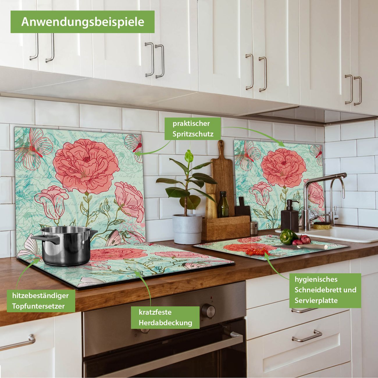 FUNKTION: Das banjado Schneidebrett mit Motiv Eine Rose Ist Eine Rose ist groß und rutschfest und damit ideal für Ihre Küche. Besonders praktisch. Das Schneidebrett ist vielseitig einsetzbar: ob als Spritzschutz hinter dem Herd für Ihre Küche oder als Glas Schneidebrett als hygienische und geruchsneutrale Unterlage. Sie können ebenfalls heiße Töpfe und Pfannen bis 100°C auf der Herdplattenabdeckung abstellen. Sie erhalten ein Multitalent für Ihre Küche. QUALITÄT: Die Schneideplatte Glas besteht aus hochwertigem, gehärtetem und hitzebeständigem Glas. Wählen Sie aus einem unserer zahlreichen Motive das passende Design für Ihre Küche aus. DETAILS: Das Schneidebrett Glas groß ist in verschiedenen Größen verfügbar. Sie erhalten separate Gumminoppen damit Ihr großes Schneidebrett rutschfest in der Küche steht. VIELSEITIG: Das Schneidebrett modern ist ein Allrounder - als Schneideunterlage Küche direkt auf dem Herd oder separat und als Spritzschutz an der Wand aufgestellt - ein praktisches Küchenutensil. BANJADO: Auf Wunsch fertigen wir das Glas Schneide Brett auch als Sondergröße an. Mehrteilige Platten sind auch möglich. Kontaktieren Sie uns gern für eine Spezialanfertigung Ihrer Glasplatte Küche.