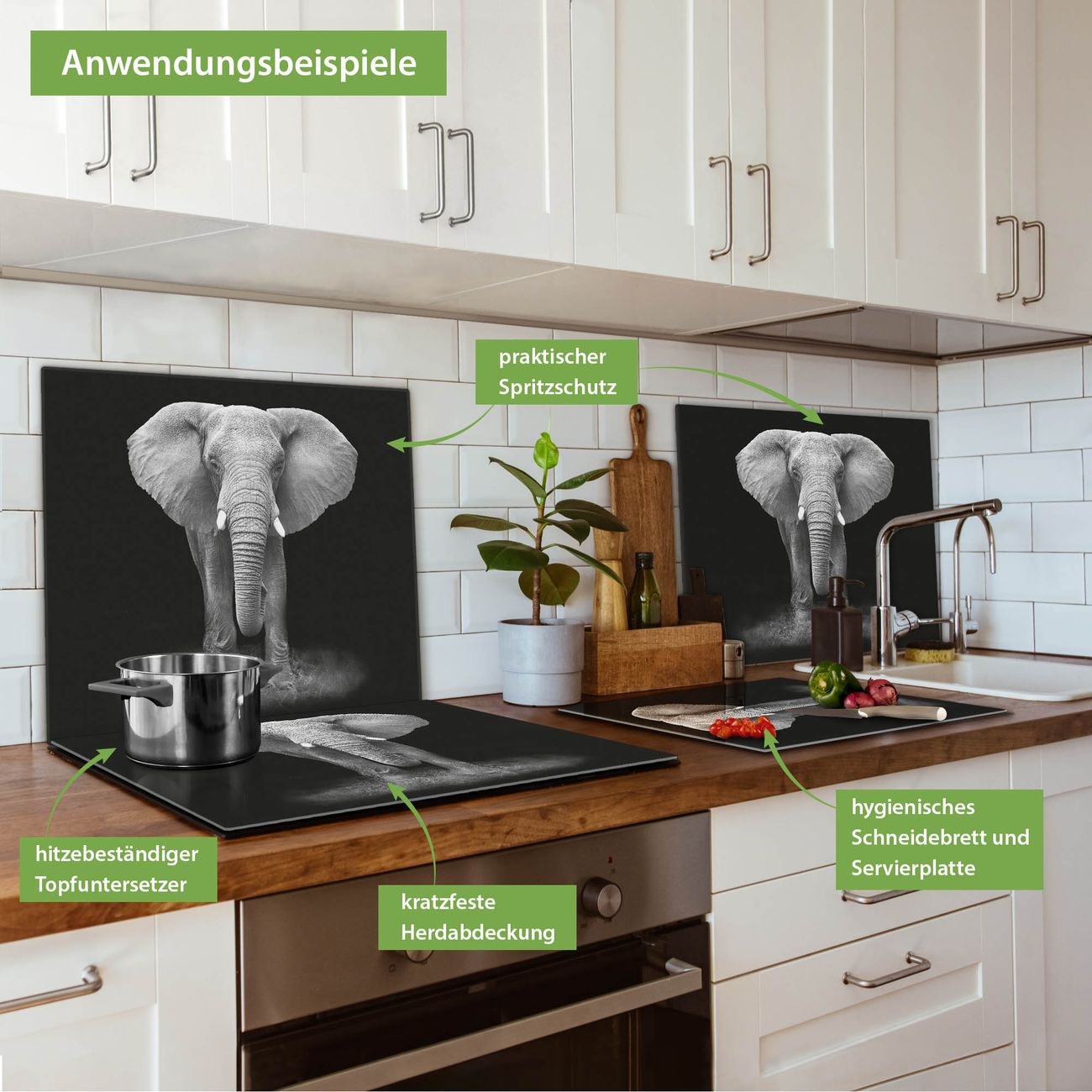 FUNKTION: Das banjado Schneidebrett mit Motiv Ella ist groß und rutschfest und damit ideal für Ihre Küche. Besonders praktisch. Das Schneidebrett ist vielseitig einsetzbar: ob als Spritzschutz hinter dem Herd für Ihre Küche oder als Glas Schneidebrett als hygienische und geruchsneutrale Unterlage. Sie können ebenfalls heiße Töpfe und Pfannen bis 100°C auf der Herdplattenabdeckung abstellen. Sie erhalten ein Multitalent für Ihre Küche. QUALITÄT: Die Schneideplatte Glas besteht aus hochwertigem, gehärtetem und hitzebeständigem Glas. Wählen Sie aus einem unserer zahlreichen Motive das passende Design für Ihre Küche aus. DETAILS: Das Schneidebrett Glas groß ist in verschiedenen Größen verfügbar. Sie erhalten separate Gumminoppen damit Ihr großes Schneidebrett rutschfest in der Küche steht. VIELSEITIG: Das Schneidebrett modern ist ein Allrounder - als Schneideunterlage Küche direkt auf dem Herd oder separat und als Spritzschutz an der Wand aufgestellt - ein praktisches Küchenutensil. BANJADO: Auf Wunsch fertigen wir das Glas Schneide Brett auch als Sondergröße an. Mehrteilige Platten sind auch möglich. Kontaktieren Sie uns gern für eine Spezialanfertigung Ihrer Glasplatte Küche.