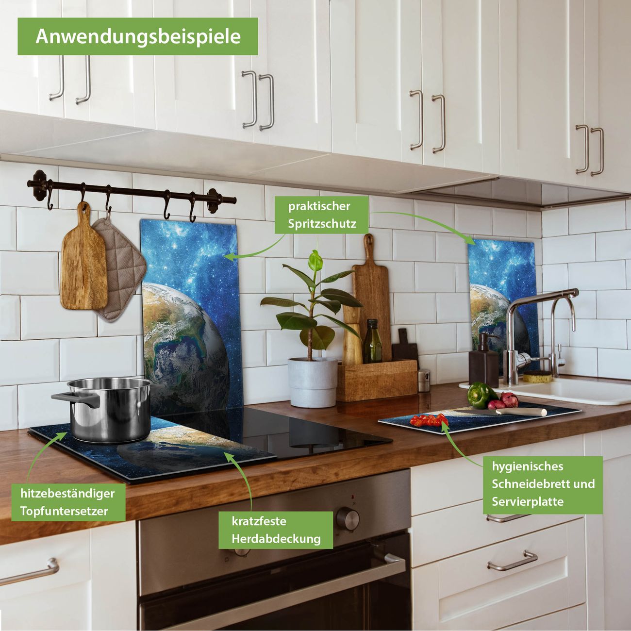 FUNKTION: Das banjado Schneidebrett mit Motiv Erdkugel ist groß und rutschfest und damit ideal für Ihre Küche. Besonders praktisch. Das Schneidebrett ist vielseitig einsetzbar: ob als Spritzschutz hinter dem Herd für Ihre Küche oder als Glas Schneidebrett als hygienische und geruchsneutrale Unterlage. Sie können ebenfalls heiße Töpfe und Pfannen bis 100°C auf der Herdplattenabdeckung abstellen. Sie erhalten ein Multitalent für Ihre Küche. QUALITÄT: Die Schneideplatte Glas besteht aus hochwertigem, gehärtetem und hitzebeständigem Glas. Wählen Sie aus einem unserer zahlreichen Motive das passende Design für Ihre Küche aus. DETAILS: Das Schneidebrett Glas groß ist in verschiedenen Größen verfügbar. Sie erhalten separate Gumminoppen damit Ihr großes Schneidebrett rutschfest in der Küche steht. VIELSEITIG: Das Schneidebrett modern ist ein Allrounder - als Schneideunterlage Küche direkt auf dem Herd oder separat und als Spritzschutz an der Wand aufgestellt - ein praktisches Küchenutensil. BANJADO: Auf Wunsch fertigen wir das Glas Schneide Brett auch als Sondergröße an. Mehrteilige Platten sind auch möglich. Kontaktieren Sie uns gern für eine Spezialanfertigung Ihrer Glasplatte Küche.