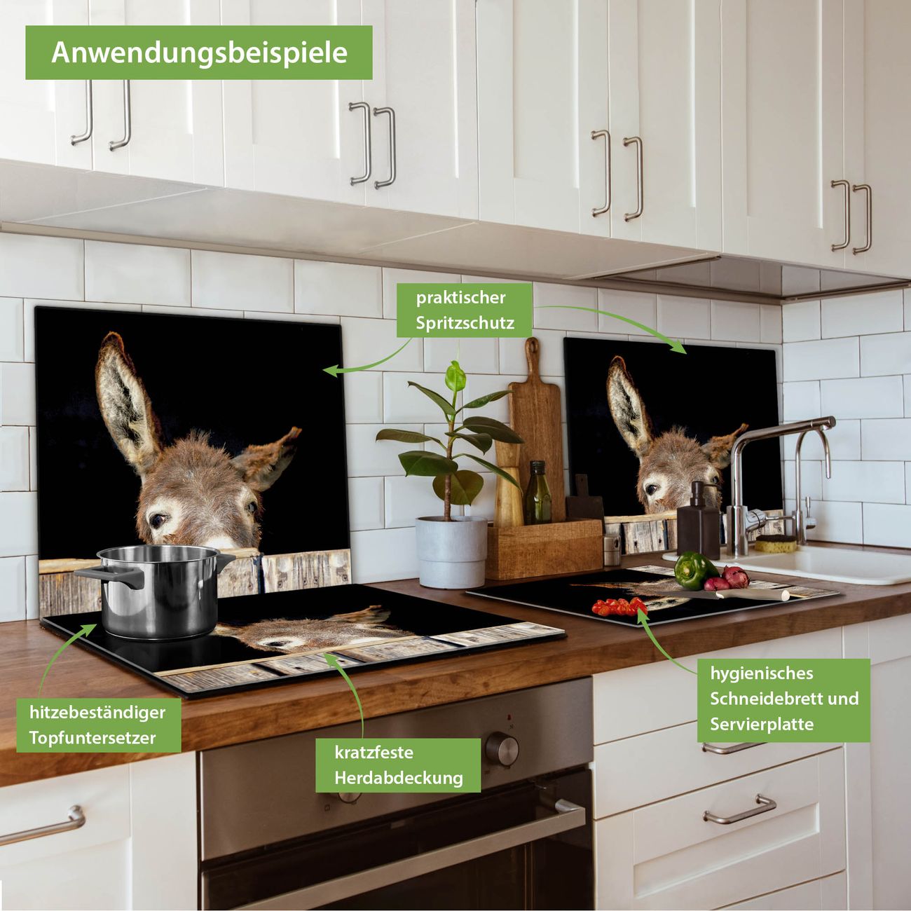 FUNKTION: Das banjado Schneidebrett mit Motiv Esel ist groß und rutschfest und damit ideal für Ihre Küche. Besonders praktisch. Das Schneidebrett ist vielseitig einsetzbar: ob als Spritzschutz hinter dem Herd für Ihre Küche oder als Glas Schneidebrett als hygienische und geruchsneutrale Unterlage. Sie können ebenfalls heiße Töpfe und Pfannen bis 100°C auf der Herdplattenabdeckung abstellen. Sie erhalten ein Multitalent für Ihre Küche. QUALITÄT: Die Schneideplatte Glas besteht aus hochwertigem, gehärtetem und hitzebeständigem Glas. Wählen Sie aus einem unserer zahlreichen Motive das passende Design für Ihre Küche aus. DETAILS: Das Schneidebrett Glas groß ist in verschiedenen Größen verfügbar. Sie erhalten separate Gumminoppen damit Ihr großes Schneidebrett rutschfest in der Küche steht. VIELSEITIG: Das Schneidebrett modern ist ein Allrounder - als Schneideunterlage Küche direkt auf dem Herd oder separat und als Spritzschutz an der Wand aufgestellt - ein praktisches Küchenutensil. BANJADO: Auf Wunsch fertigen wir das Glas Schneide Brett auch als Sondergröße an. Mehrteilige Platten sind auch möglich. Kontaktieren Sie uns gern für eine Spezialanfertigung Ihrer Glasplatte Küche.