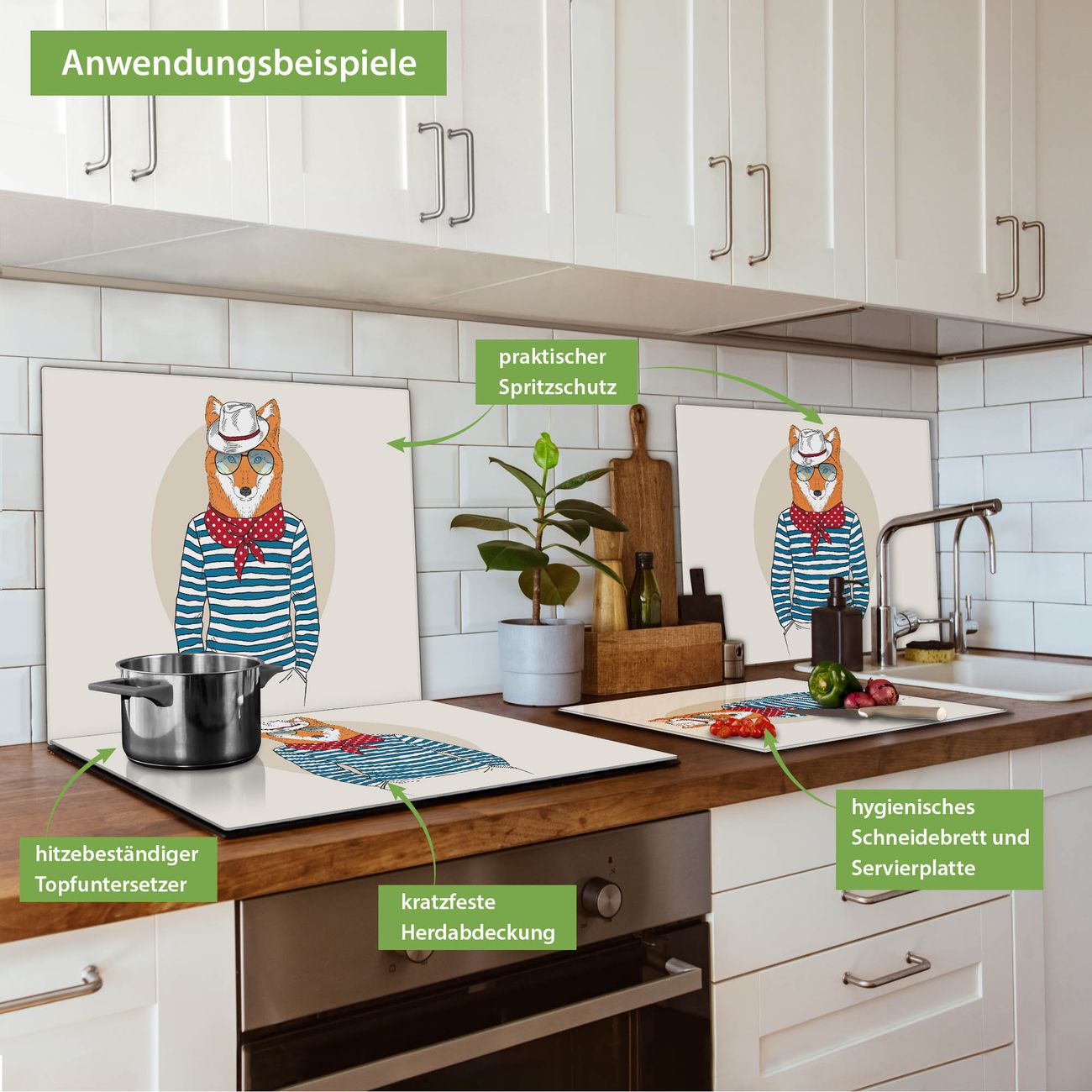 FUNKTION: Das banjado Schneidebrett mit Motiv Fancy Fox ist groß und rutschfest und damit ideal für Ihre Küche. Besonders praktisch. Das Schneidebrett ist vielseitig einsetzbar: ob als Spritzschutz hinter dem Herd für Ihre Küche oder als Glas Schneidebrett als hygienische und geruchsneutrale Unterlage. Sie können ebenfalls heiße Töpfe und Pfannen bis 100°C auf der Herdplattenabdeckung abstellen. Sie erhalten ein Multitalent für Ihre Küche. QUALITÄT: Die Schneideplatte Glas besteht aus hochwertigem, gehärtetem und hitzebeständigem Glas. Wählen Sie aus einem unserer zahlreichen Motive das passende Design für Ihre Küche aus. DETAILS: Das Schneidebrett Glas groß ist in verschiedenen Größen verfügbar. Sie erhalten separate Gumminoppen damit Ihr großes Schneidebrett rutschfest in der Küche steht. VIELSEITIG: Das Schneidebrett modern ist ein Allrounder - als Schneideunterlage Küche direkt auf dem Herd oder separat und als Spritzschutz an der Wand aufgestellt - ein praktisches Küchenutensil. BANJADO: Auf Wunsch fertigen wir das Glas Schneide Brett auch als Sondergröße an. Mehrteilige Platten sind auch möglich. Kontaktieren Sie uns gern für eine Spezialanfertigung Ihrer Glasplatte Küche.