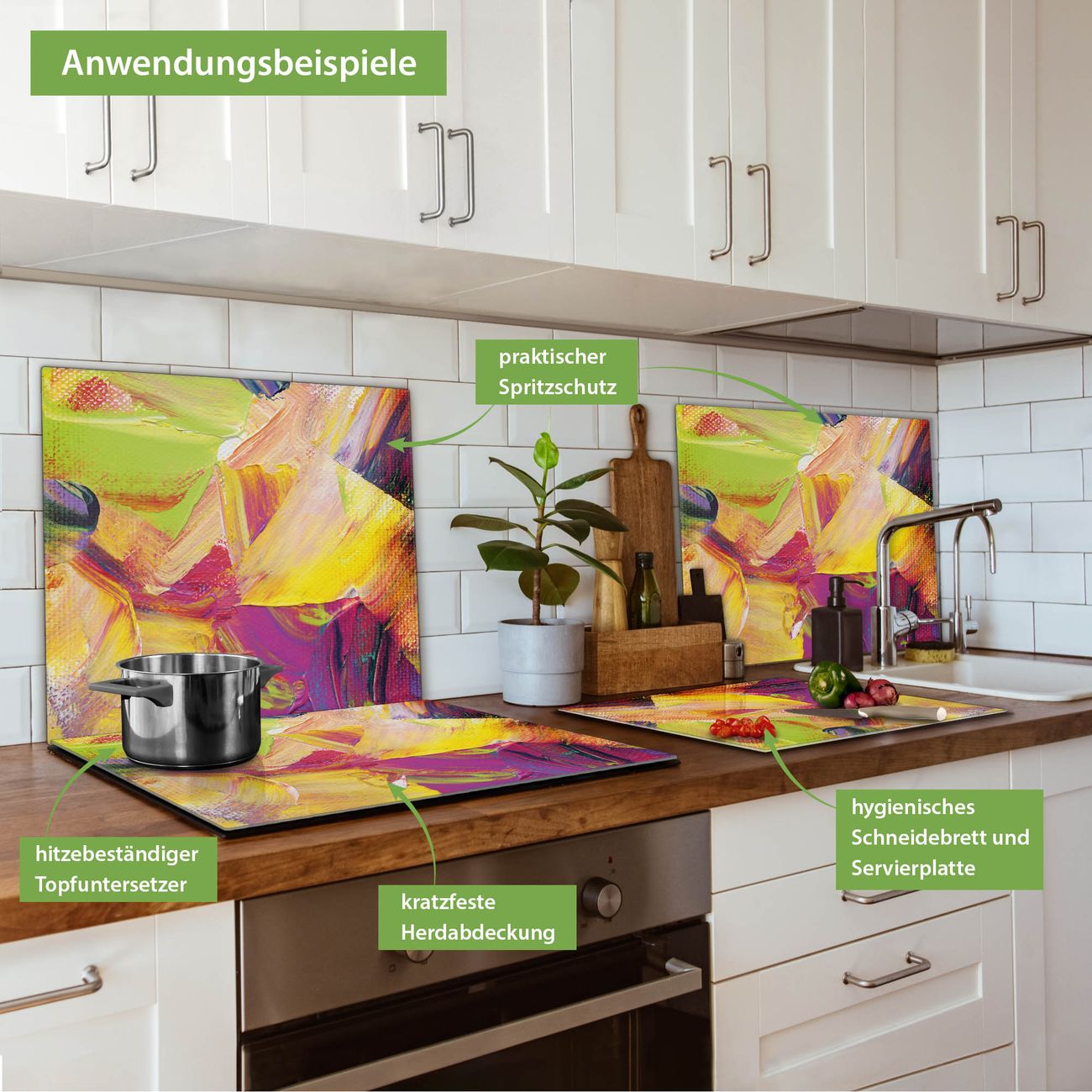 FUNKTION: Das banjado Schneidebrett mit Motiv Farbe auf Leinwand ist groß und rutschfest und damit ideal für Ihre Küche. Besonders praktisch. Das Schneidebrett ist vielseitig einsetzbar: ob als Spritzschutz hinter dem Herd für Ihre Küche oder als Glas Schneidebrett als hygienische und geruchsneutrale Unterlage. Sie können ebenfalls heiße Töpfe und Pfannen bis 100°C auf der Herdplattenabdeckung abstellen. Sie erhalten ein Multitalent für Ihre Küche. QUALITÄT: Die Schneideplatte Glas besteht aus hochwertigem, gehärtetem und hitzebeständigem Glas. Wählen Sie aus einem unserer zahlreichen Motive das passende Design für Ihre Küche aus. DETAILS: Das Schneidebrett Glas groß ist in verschiedenen Größen verfügbar. Sie erhalten separate Gumminoppen damit Ihr großes Schneidebrett rutschfest in der Küche steht. VIELSEITIG: Das Schneidebrett modern ist ein Allrounder - als Schneideunterlage Küche direkt auf dem Herd oder separat und als Spritzschutz an der Wand aufgestellt - ein praktisches Küchenutensil. BANJADO: Auf Wunsch fertigen wir das Glas Schneide Brett auch als Sondergröße an. Mehrteilige Platten sind auch möglich. Kontaktieren Sie uns gern für eine Spezialanfertigung Ihrer Glasplatte Küche.