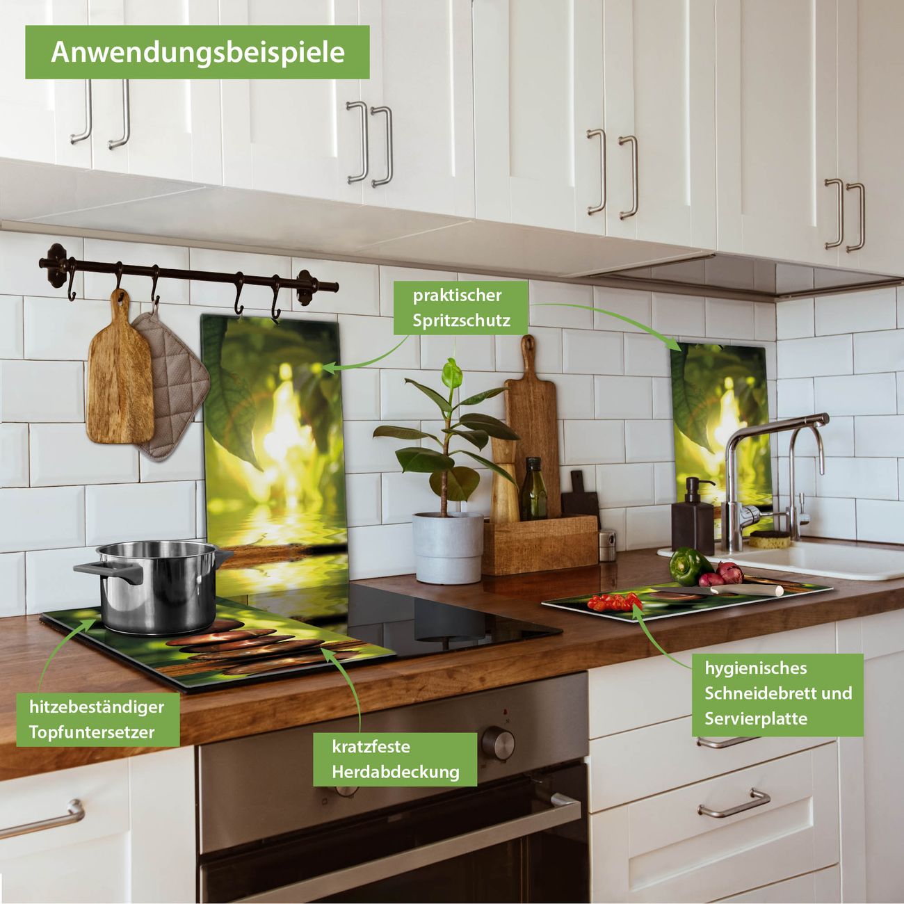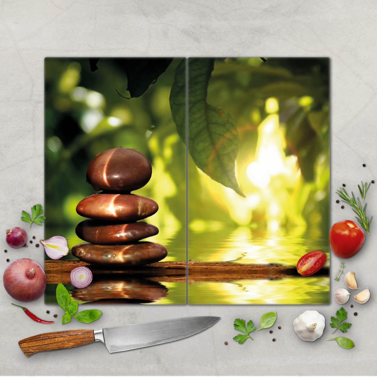 FUNKTION: Das banjado Schneidebrett mit Motiv Feng Shui ist groß und rutschfest und damit ideal für Ihre Küche. Besonders praktisch. Das Schneidebrett ist vielseitig einsetzbar: ob als Spritzschutz hinter dem Herd für Ihre Küche oder als Glas Schneidebrett als hygienische und geruchsneutrale Unterlage. Sie können ebenfalls heiße Töpfe und Pfannen bis 100°C auf der Herdplattenabdeckung abstellen. Sie erhalten ein Multitalent für Ihre Küche. QUALITÄT: Die Schneideplatte Glas besteht aus hochwertigem, gehärtetem und hitzebeständigem Glas. Wählen Sie aus einem unserer zahlreichen Motive das passende Design für Ihre Küche aus. DETAILS: Das Schneidebrett Glas groß ist in verschiedenen Größen verfügbar. Sie erhalten separate Gumminoppen damit Ihr großes Schneidebrett rutschfest in der Küche steht. VIELSEITIG: Das Schneidebrett modern ist ein Allrounder - als Schneideunterlage Küche direkt auf dem Herd oder separat und als Spritzschutz an der Wand aufgestellt - ein praktisches Küchenutensil. BANJADO: Auf Wunsch fertigen wir das Glas Schneide Brett auch als Sondergröße an. Mehrteilige Platten sind auch möglich. Kontaktieren Sie uns gern für eine Spezialanfertigung Ihrer Glasplatte Küche.