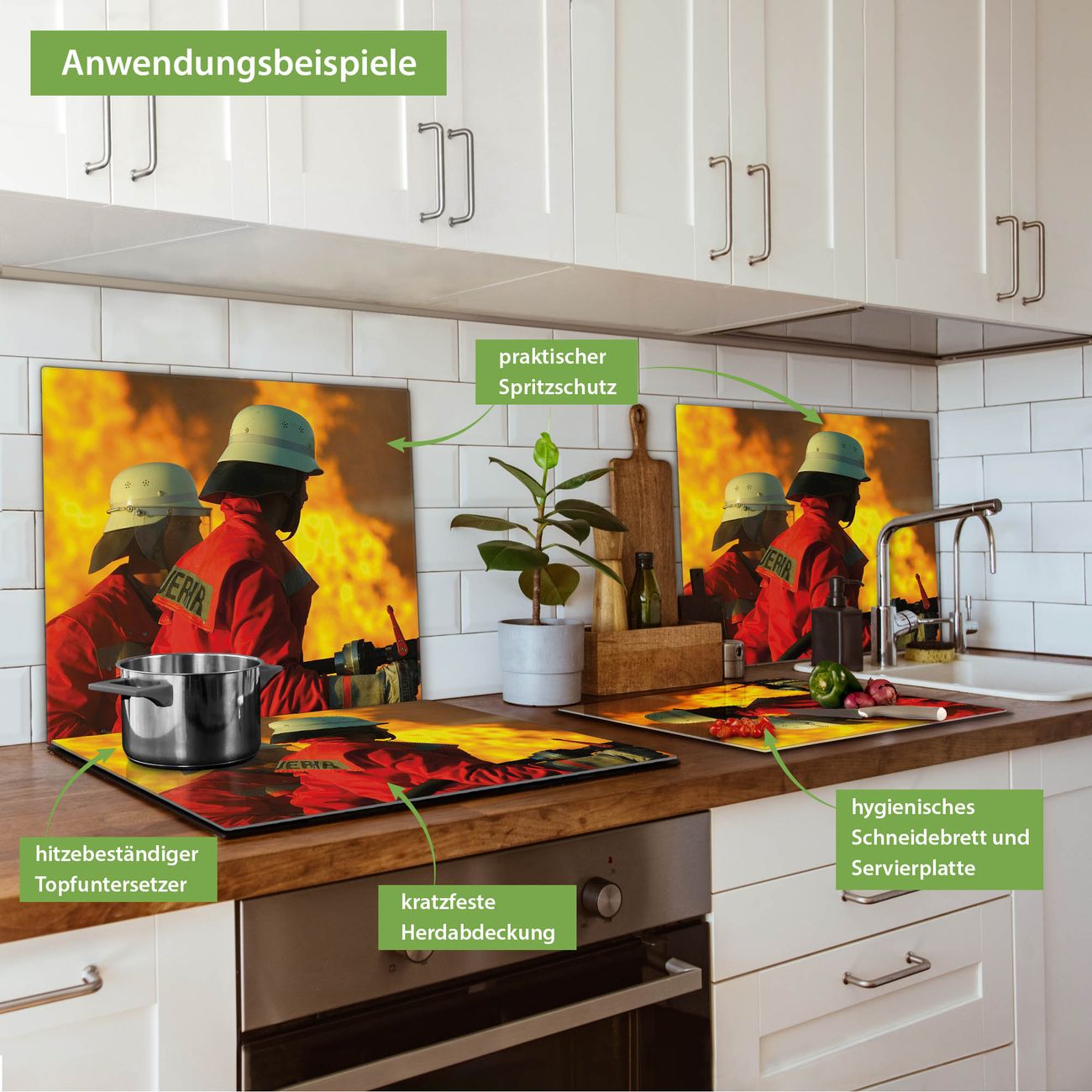 FUNKTION: Das banjado Schneidebrett mit Motiv Feuer ist groß und rutschfest und damit ideal für Ihre Küche. Besonders praktisch. Das Schneidebrett ist vielseitig einsetzbar: ob als Spritzschutz hinter dem Herd für Ihre Küche oder als Glas Schneidebrett als hygienische und geruchsneutrale Unterlage. Sie können ebenfalls heiße Töpfe und Pfannen bis 100°C auf der Herdplattenabdeckung abstellen. Sie erhalten ein Multitalent für Ihre Küche. QUALITÄT: Die Schneideplatte Glas besteht aus hochwertigem, gehärtetem und hitzebeständigem Glas. Wählen Sie aus einem unserer zahlreichen Motive das passende Design für Ihre Küche aus. DETAILS: Das Schneidebrett Glas groß ist in verschiedenen Größen verfügbar. Sie erhalten separate Gumminoppen damit Ihr großes Schneidebrett rutschfest in der Küche steht. VIELSEITIG: Das Schneidebrett modern ist ein Allrounder - als Schneideunterlage Küche direkt auf dem Herd oder separat und als Spritzschutz an der Wand aufgestellt - ein praktisches Küchenutensil. BANJADO: Auf Wunsch fertigen wir das Glas Schneide Brett auch als Sondergröße an. Mehrteilige Platten sind auch möglich. Kontaktieren Sie uns gern für eine Spezialanfertigung Ihrer Glasplatte Küche.