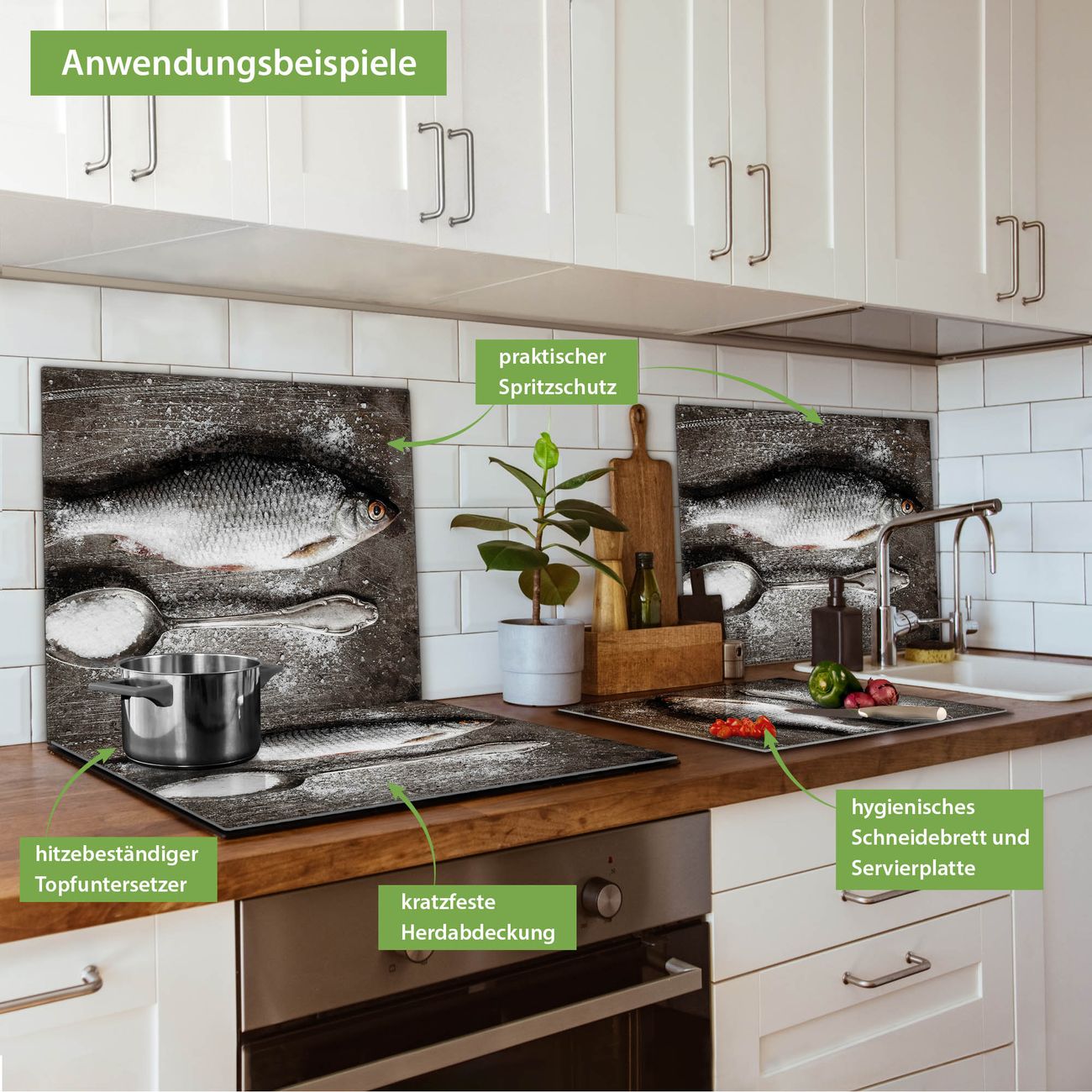 FUNKTION: Das banjado Schneidebrett mit Motiv Fisch Und Salz ist groß und rutschfest und damit ideal für Ihre Küche. Besonders praktisch. Das Schneidebrett ist vielseitig einsetzbar: ob als Spritzschutz hinter dem Herd für Ihre Küche oder als Glas Schneidebrett als hygienische und geruchsneutrale Unterlage. Sie können ebenfalls heiße Töpfe und Pfannen bis 100°C auf der Herdplattenabdeckung abstellen. Sie erhalten ein Multitalent für Ihre Küche. QUALITÄT: Die Schneideplatte Glas besteht aus hochwertigem, gehärtetem und hitzebeständigem Glas. Wählen Sie aus einem unserer zahlreichen Motive das passende Design für Ihre Küche aus. DETAILS: Das Schneidebrett Glas groß ist in verschiedenen Größen verfügbar. Sie erhalten separate Gumminoppen damit Ihr großes Schneidebrett rutschfest in der Küche steht. VIELSEITIG: Das Schneidebrett modern ist ein Allrounder - als Schneideunterlage Küche direkt auf dem Herd oder separat und als Spritzschutz an der Wand aufgestellt - ein praktisches Küchenutensil. BANJADO: Auf Wunsch fertigen wir das Glas Schneide Brett auch als Sondergröße an. Mehrteilige Platten sind auch möglich. Kontaktieren Sie uns gern für eine Spezialanfertigung Ihrer Glasplatte Küche.