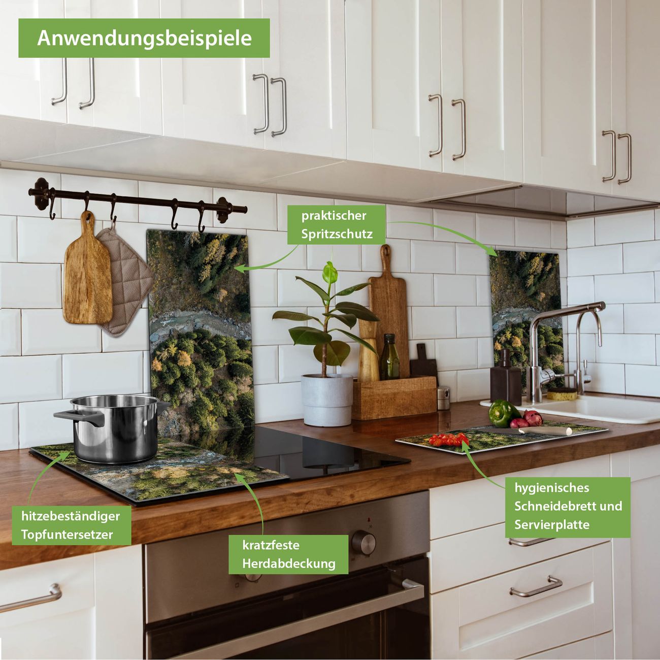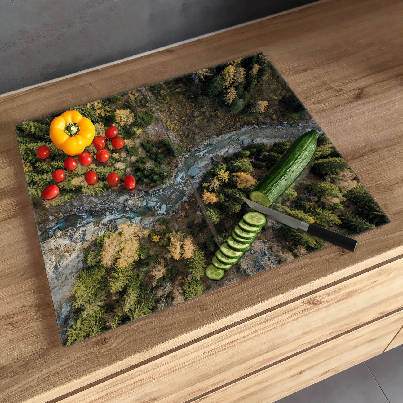 FUNKTION: Das banjado Schneidebrett mit Motiv Fluss im Tal 2 ist groß und rutschfest und damit ideal für Ihre Küche. Besonders praktisch. Das Schneidebrett ist vielseitig einsetzbar: ob als Spritzschutz hinter dem Herd für Ihre Küche oder als Glas Schneidebrett als hygienische und geruchsneutrale Unterlage. Sie können ebenfalls heiße Töpfe und Pfannen bis 100°C auf der Herdplattenabdeckung abstellen. Sie erhalten ein Multitalent für Ihre Küche. QUALITÄT: Die Schneideplatte Glas besteht aus hochwertigem, gehärtetem und hitzebeständigem Glas. Wählen Sie aus einem unserer zahlreichen Motive das passende Design für Ihre Küche aus. DETAILS: Das Schneidebrett Glas groß ist in verschiedenen Größen verfügbar. Sie erhalten separate Gumminoppen damit Ihr großes Schneidebrett rutschfest in der Küche steht. VIELSEITIG: Das Schneidebrett modern ist ein Allrounder - als Schneideunterlage Küche direkt auf dem Herd oder separat und als Spritzschutz an der Wand aufgestellt - ein praktisches Küchenutensil. BANJADO: Auf Wunsch fertigen wir das Glas Schneide Brett auch als Sondergröße an. Mehrteilige Platten sind auch möglich. Kontaktieren Sie uns gern für eine Spezialanfertigung Ihrer Glasplatte Küche.