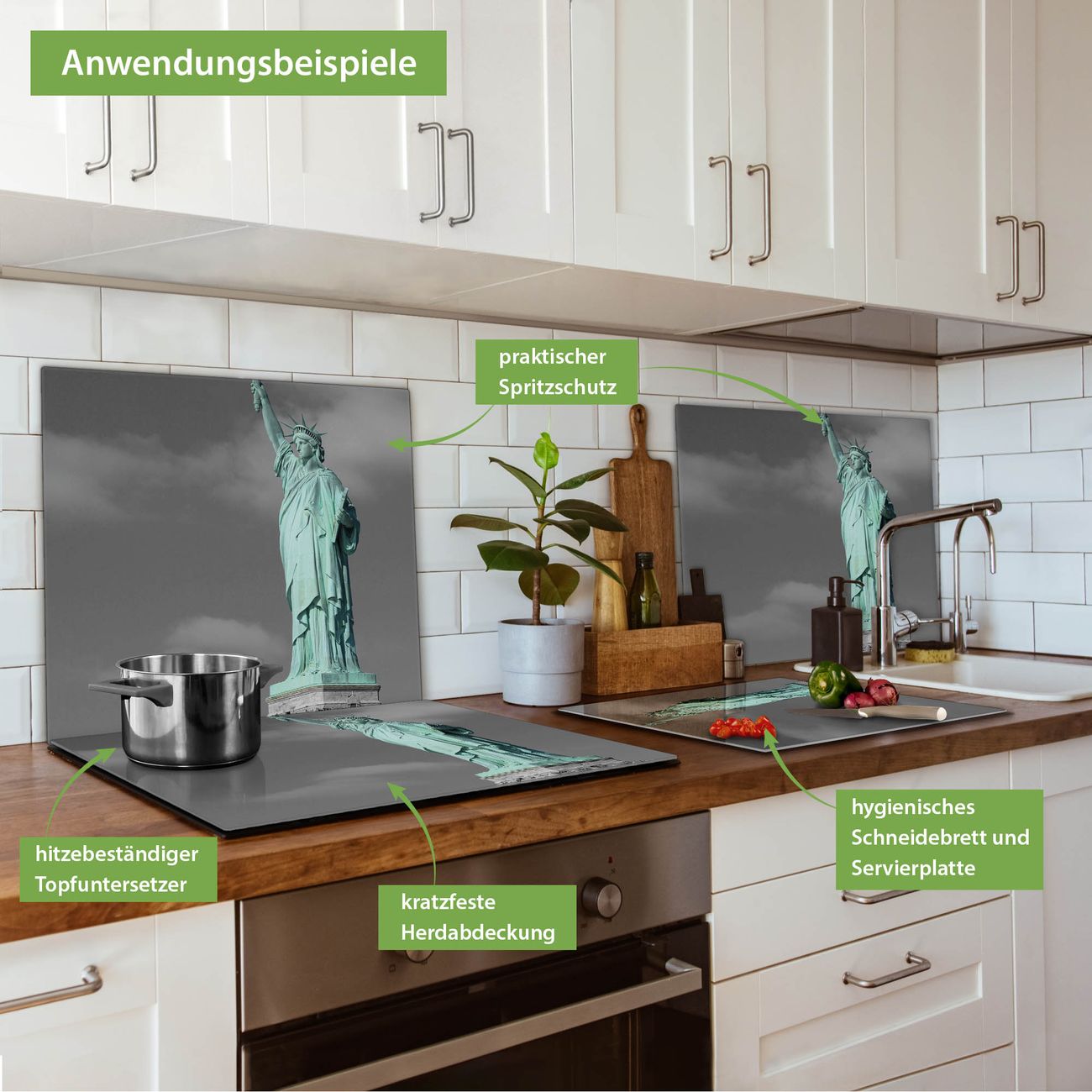 FUNKTION: Das banjado Schneidebrett mit Motiv Freiheitsstatue ist groß und rutschfest und damit ideal für Ihre Küche. Besonders praktisch. Das Schneidebrett ist vielseitig einsetzbar: ob als Spritzschutz hinter dem Herd für Ihre Küche oder als Glas Schneidebrett als hygienische und geruchsneutrale Unterlage. Sie können ebenfalls heiße Töpfe und Pfannen bis 100°C auf der Herdplattenabdeckung abstellen. Sie erhalten ein Multitalent für Ihre Küche. QUALITÄT: Die Schneideplatte Glas besteht aus hochwertigem, gehärtetem und hitzebeständigem Glas. Wählen Sie aus einem unserer zahlreichen Motive das passende Design für Ihre Küche aus. DETAILS: Das Schneidebrett Glas groß ist in verschiedenen Größen verfügbar. Sie erhalten separate Gumminoppen damit Ihr großes Schneidebrett rutschfest in der Küche steht. VIELSEITIG: Das Schneidebrett modern ist ein Allrounder - als Schneideunterlage Küche direkt auf dem Herd oder separat und als Spritzschutz an der Wand aufgestellt - ein praktisches Küchenutensil. BANJADO: Auf Wunsch fertigen wir das Glas Schneide Brett auch als Sondergröße an. Mehrteilige Platten sind auch möglich. Kontaktieren Sie uns gern für eine Spezialanfertigung Ihrer Glasplatte Küche.