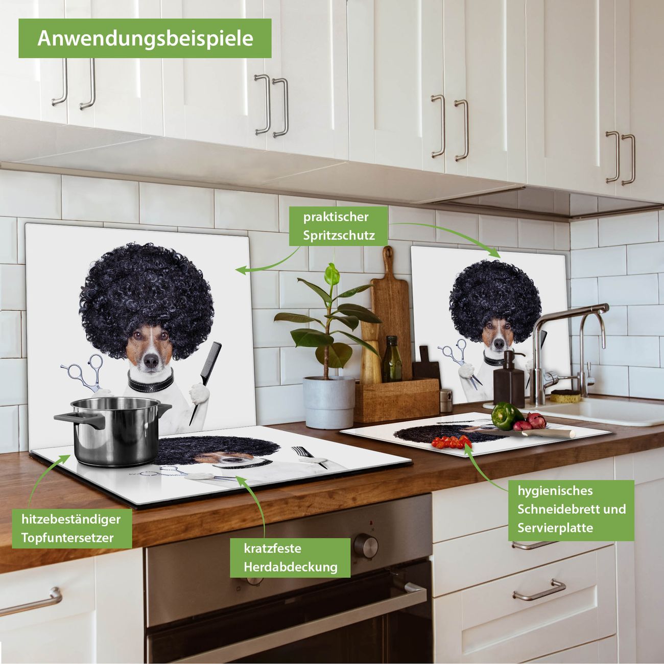 FUNKTION: Das banjado Schneidebrett mit Motiv Friseur Jack Russel ist groß und rutschfest und damit ideal für Ihre Küche. Besonders praktisch. Das Schneidebrett ist vielseitig einsetzbar: ob als Spritzschutz hinter dem Herd für Ihre Küche oder als Glas Schneidebrett als hygienische und geruchsneutrale Unterlage. Sie können ebenfalls heiße Töpfe und Pfannen bis 100°C auf der Herdplattenabdeckung abstellen. Sie erhalten ein Multitalent für Ihre Küche. QUALITÄT: Die Schneideplatte Glas besteht aus hochwertigem, gehärtetem und hitzebeständigem Glas. Wählen Sie aus einem unserer zahlreichen Motive das passende Design für Ihre Küche aus. DETAILS: Das Schneidebrett Glas groß ist in verschiedenen Größen verfügbar. Sie erhalten separate Gumminoppen damit Ihr großes Schneidebrett rutschfest in der Küche steht. VIELSEITIG: Das Schneidebrett modern ist ein Allrounder - als Schneideunterlage Küche direkt auf dem Herd oder separat und als Spritzschutz an der Wand aufgestellt - ein praktisches Küchenutensil. BANJADO: Auf Wunsch fertigen wir das Glas Schneide Brett auch als Sondergröße an. Mehrteilige Platten sind auch möglich. Kontaktieren Sie uns gern für eine Spezialanfertigung Ihrer Glasplatte Küche.
