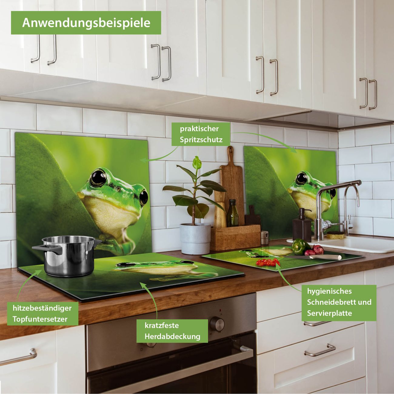 FUNKTION: Das banjado Schneidebrett mit Motiv Frosch ist groß und rutschfest und damit ideal für Ihre Küche. Besonders praktisch. Das Schneidebrett ist vielseitig einsetzbar: ob als Spritzschutz hinter dem Herd für Ihre Küche oder als Glas Schneidebrett als hygienische und geruchsneutrale Unterlage. Sie können ebenfalls heiße Töpfe und Pfannen bis 100°C auf der Herdplattenabdeckung abstellen. Sie erhalten ein Multitalent für Ihre Küche. QUALITÄT: Die Schneideplatte Glas besteht aus hochwertigem, gehärtetem und hitzebeständigem Glas. Wählen Sie aus einem unserer zahlreichen Motive das passende Design für Ihre Küche aus. DETAILS: Das Schneidebrett Glas groß ist in verschiedenen Größen verfügbar. Sie erhalten separate Gumminoppen damit Ihr großes Schneidebrett rutschfest in der Küche steht. VIELSEITIG: Das Schneidebrett modern ist ein Allrounder - als Schneideunterlage Küche direkt auf dem Herd oder separat und als Spritzschutz an der Wand aufgestellt - ein praktisches Küchenutensil. BANJADO: Auf Wunsch fertigen wir das Glas Schneide Brett auch als Sondergröße an. Mehrteilige Platten sind auch möglich. Kontaktieren Sie uns gern für eine Spezialanfertigung Ihrer Glasplatte Küche.
