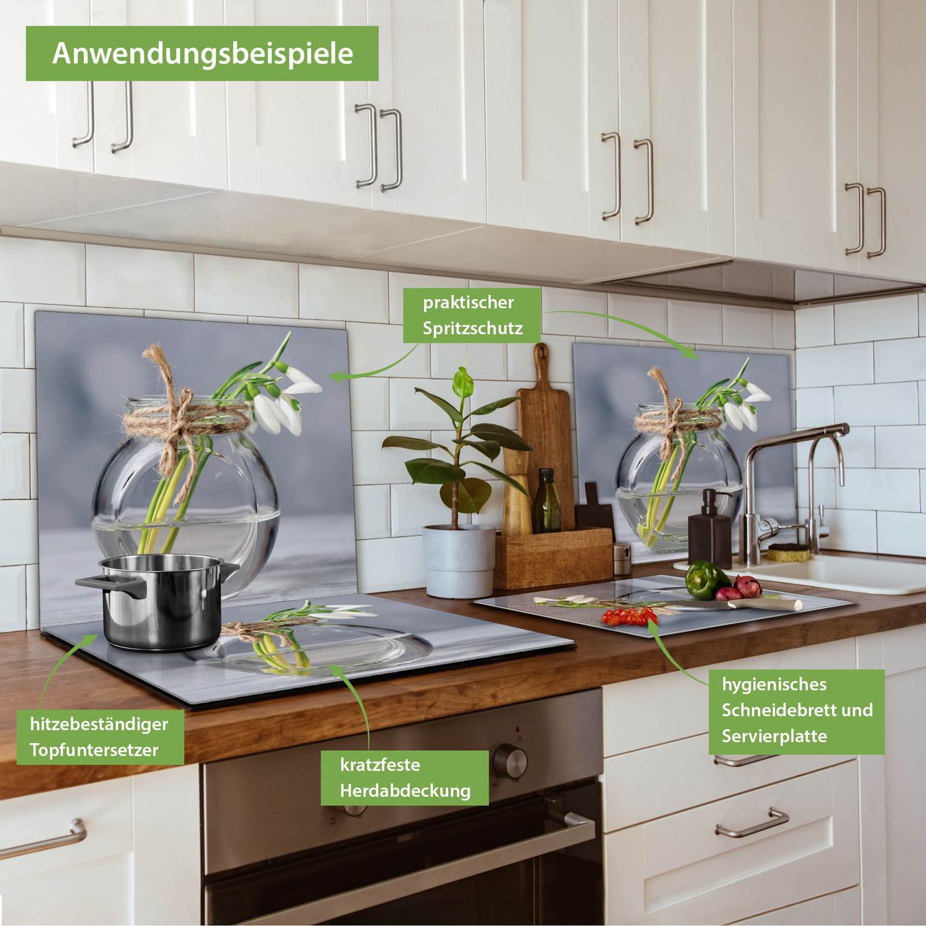 FUNKTION: Das banjado Schneidebrett mit Motiv Gänseblümchen im Glas ist groß und rutschfest und damit ideal für Ihre Küche. Besonders praktisch. Das Schneidebrett ist vielseitig einsetzbar: ob als Spritzschutz hinter dem Herd für Ihre Küche oder als Glas Schneidebrett als hygienische und geruchsneutrale Unterlage. Sie können ebenfalls heiße Töpfe und Pfannen bis 100°C auf der Herdplattenabdeckung abstellen. Sie erhalten ein Multitalent für Ihre Küche. QUALITÄT: Die Schneideplatte Glas besteht aus hochwertigem, gehärtetem und hitzebeständigem Glas. Wählen Sie aus einem unserer zahlreichen Motive das passende Design für Ihre Küche aus. DETAILS: Das Schneidebrett Glas groß ist in verschiedenen Größen verfügbar. Sie erhalten separate Gumminoppen damit Ihr großes Schneidebrett rutschfest in der Küche steht. VIELSEITIG: Das Schneidebrett modern ist ein Allrounder - als Schneideunterlage Küche direkt auf dem Herd oder separat und als Spritzschutz an der Wand aufgestellt - ein praktisches Küchenutensil. BANJADO: Auf Wunsch fertigen wir das Glas Schneide Brett auch als Sondergröße an. Mehrteilige Platten sind auch möglich. Kontaktieren Sie uns gern für eine Spezialanfertigung Ihrer Glasplatte Küche.