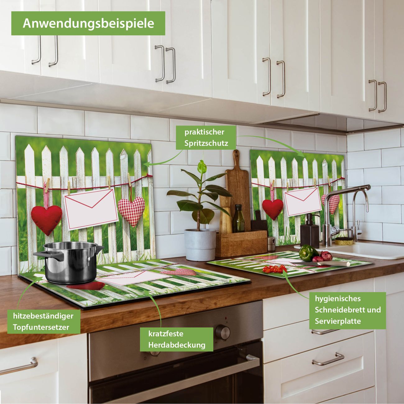 FUNKTION: Das banjado Schneidebrett mit Motiv Gartenzaun ist groß und rutschfest und damit ideal für Ihre Küche. Besonders praktisch. Das Schneidebrett ist vielseitig einsetzbar: ob als Spritzschutz hinter dem Herd für Ihre Küche oder als Glas Schneidebrett als hygienische und geruchsneutrale Unterlage. Sie können ebenfalls heiße Töpfe und Pfannen bis 100°C auf der Herdplattenabdeckung abstellen. Sie erhalten ein Multitalent für Ihre Küche. QUALITÄT: Die Schneideplatte Glas besteht aus hochwertigem, gehärtetem und hitzebeständigem Glas. Wählen Sie aus einem unserer zahlreichen Motive das passende Design für Ihre Küche aus. DETAILS: Das Schneidebrett Glas groß ist in verschiedenen Größen verfügbar. Sie erhalten separate Gumminoppen damit Ihr großes Schneidebrett rutschfest in der Küche steht. VIELSEITIG: Das Schneidebrett modern ist ein Allrounder - als Schneideunterlage Küche direkt auf dem Herd oder separat und als Spritzschutz an der Wand aufgestellt - ein praktisches Küchenutensil. BANJADO: Auf Wunsch fertigen wir das Glas Schneide Brett auch als Sondergröße an. Mehrteilige Platten sind auch möglich. Kontaktieren Sie uns gern für eine Spezialanfertigung Ihrer Glasplatte Küche.
