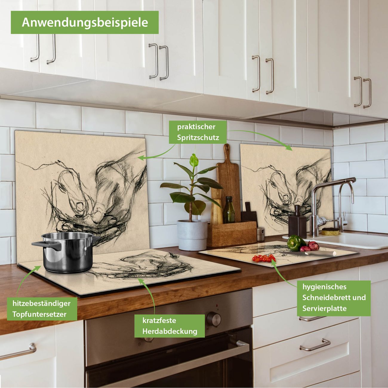 FUNKTION: Das banjado Schneidebrett mit Motiv Gefaltete Hände ist groß und rutschfest und damit ideal für Ihre Küche. Besonders praktisch. Das Schneidebrett ist vielseitig einsetzbar: ob als Spritzschutz hinter dem Herd für Ihre Küche oder als Glas Schneidebrett als hygienische und geruchsneutrale Unterlage. Sie können ebenfalls heiße Töpfe und Pfannen bis 100°C auf der Herdplattenabdeckung abstellen. Sie erhalten ein Multitalent für Ihre Küche. QUALITÄT: Die Schneideplatte Glas besteht aus hochwertigem, gehärtetem und hitzebeständigem Glas. Wählen Sie aus einem unserer zahlreichen Motive das passende Design für Ihre Küche aus. DETAILS: Das Schneidebrett Glas groß ist in verschiedenen Größen verfügbar. Sie erhalten separate Gumminoppen damit Ihr großes Schneidebrett rutschfest in der Küche steht. VIELSEITIG: Das Schneidebrett modern ist ein Allrounder - als Schneideunterlage Küche direkt auf dem Herd oder separat und als Spritzschutz an der Wand aufgestellt - ein praktisches Küchenutensil. BANJADO: Auf Wunsch fertigen wir das Glas Schneide Brett auch als Sondergröße an. Mehrteilige Platten sind auch möglich. Kontaktieren Sie uns gern für eine Spezialanfertigung Ihrer Glasplatte Küche.