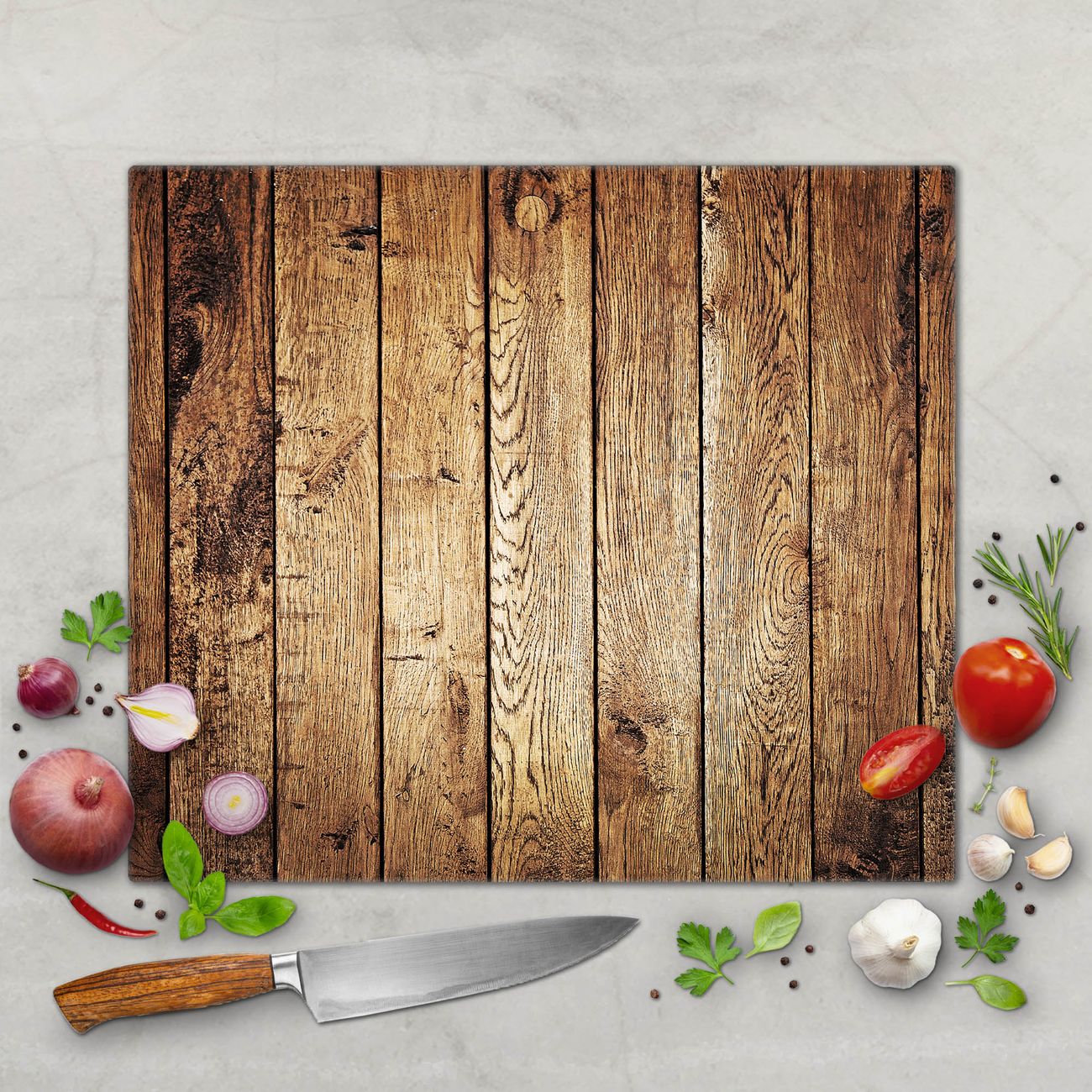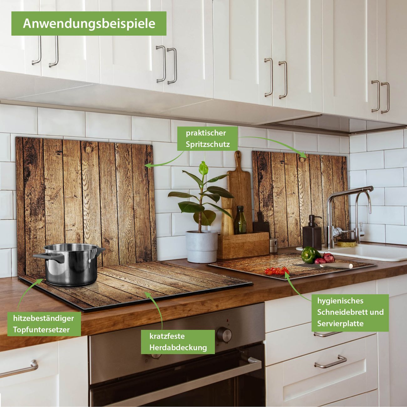 FUNKTION: Das banjado Schneidebrett mit Motiv Geöltes Holz ist groß und rutschfest und damit ideal für Ihre Küche. Besonders praktisch. Das Schneidebrett ist vielseitig einsetzbar: ob als Spritzschutz hinter dem Herd für Ihre Küche oder als Glas Schneidebrett als hygienische und geruchsneutrale Unterlage. Sie können ebenfalls heiße Töpfe und Pfannen bis 100°C auf der Herdplattenabdeckung abstellen. Sie erhalten ein Multitalent für Ihre Küche. QUALITÄT: Die Schneideplatte Glas besteht aus hochwertigem, gehärtetem und hitzebeständigem Glas. Wählen Sie aus einem unserer zahlreichen Motive das passende Design für Ihre Küche aus. DETAILS: Das Schneidebrett Glas groß ist in verschiedenen Größen verfügbar. Sie erhalten separate Gumminoppen damit Ihr großes Schneidebrett rutschfest in der Küche steht. VIELSEITIG: Das Schneidebrett modern ist ein Allrounder - als Schneideunterlage Küche direkt auf dem Herd oder separat und als Spritzschutz an der Wand aufgestellt - ein praktisches Küchenutensil. BANJADO: Auf Wunsch fertigen wir das Glas Schneide Brett auch als Sondergröße an. Mehrteilige Platten sind auch möglich. Kontaktieren Sie uns gern für eine Spezialanfertigung Ihrer Glasplatte Küche.