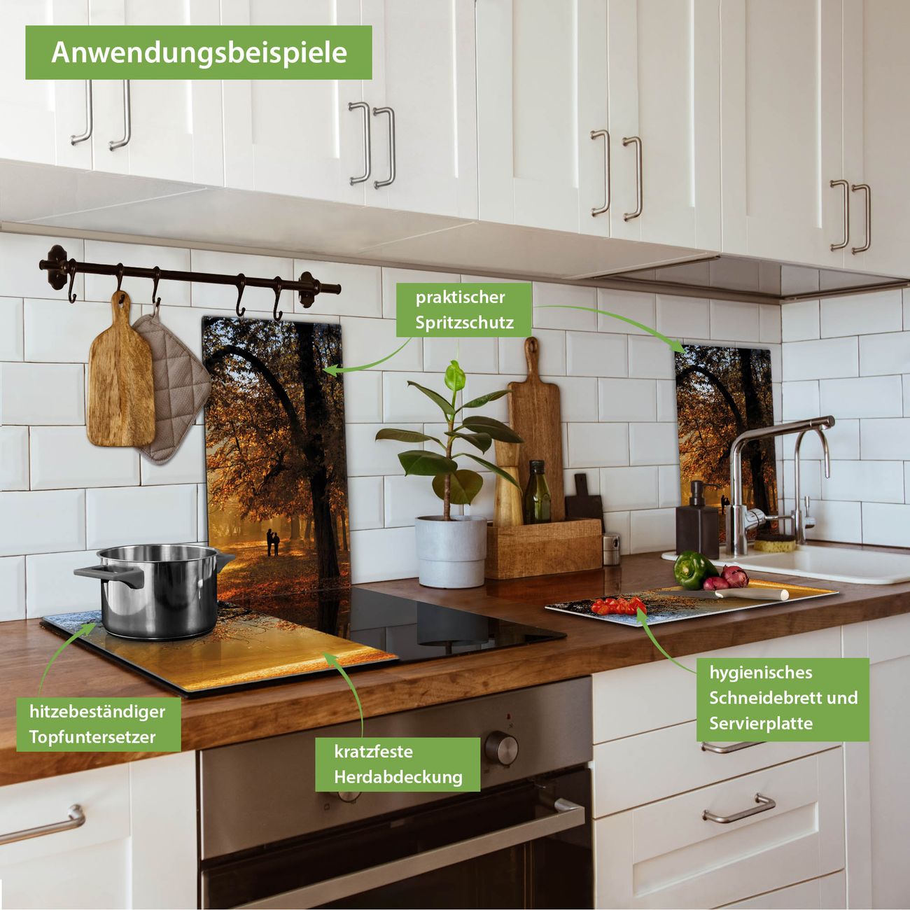 FUNKTION: Das banjado Schneidebrett mit Motiv Goldener Herbst ist groß und rutschfest und damit ideal für Ihre Küche. Besonders praktisch. Das Schneidebrett ist vielseitig einsetzbar: ob als Spritzschutz hinter dem Herd für Ihre Küche oder als Glas Schneidebrett als hygienische und geruchsneutrale Unterlage. Sie können ebenfalls heiße Töpfe und Pfannen bis 100°C auf der Herdplattenabdeckung abstellen. Sie erhalten ein Multitalent für Ihre Küche. QUALITÄT: Die Schneideplatte Glas besteht aus hochwertigem, gehärtetem und hitzebeständigem Glas. Wählen Sie aus einem unserer zahlreichen Motive das passende Design für Ihre Küche aus. DETAILS: Das Schneidebrett Glas groß ist in verschiedenen Größen verfügbar. Sie erhalten separate Gumminoppen damit Ihr großes Schneidebrett rutschfest in der Küche steht. VIELSEITIG: Das Schneidebrett modern ist ein Allrounder - als Schneideunterlage Küche direkt auf dem Herd oder separat und als Spritzschutz an der Wand aufgestellt - ein praktisches Küchenutensil. BANJADO: Auf Wunsch fertigen wir das Glas Schneide Brett auch als Sondergröße an. Mehrteilige Platten sind auch möglich. Kontaktieren Sie uns gern für eine Spezialanfertigung Ihrer Glasplatte Küche.