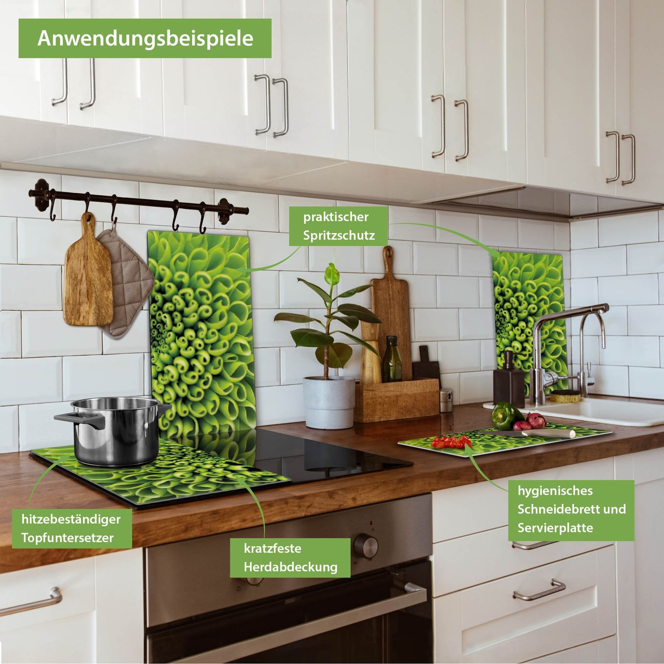 FUNKTION: Das banjado Schneidebrett mit Motiv Grüne Chrysantheme ist groß und rutschfest und damit ideal für Ihre Küche. Besonders praktisch. Das Schneidebrett ist vielseitig einsetzbar: ob als Spritzschutz hinter dem Herd für Ihre Küche oder als Glas Schneidebrett als hygienische und geruchsneutrale Unterlage. Sie können ebenfalls heiße Töpfe und Pfannen bis 100°C auf der Herdplattenabdeckung abstellen. Sie erhalten ein Multitalent für Ihre Küche. QUALITÄT: Die Schneideplatte Glas besteht aus hochwertigem, gehärtetem und hitzebeständigem Glas. Wählen Sie aus einem unserer zahlreichen Motive das passende Design für Ihre Küche aus. DETAILS: Das Schneidebrett Glas groß ist in verschiedenen Größen verfügbar. Sie erhalten separate Gumminoppen damit Ihr großes Schneidebrett rutschfest in der Küche steht. VIELSEITIG: Das Schneidebrett modern ist ein Allrounder - als Schneideunterlage Küche direkt auf dem Herd oder separat und als Spritzschutz an der Wand aufgestellt - ein praktisches Küchenutensil. BANJADO: Auf Wunsch fertigen wir das Glas Schneide Brett auch als Sondergröße an. Mehrteilige Platten sind auch möglich. Kontaktieren Sie uns gern für eine Spezialanfertigung Ihrer Glasplatte Küche.