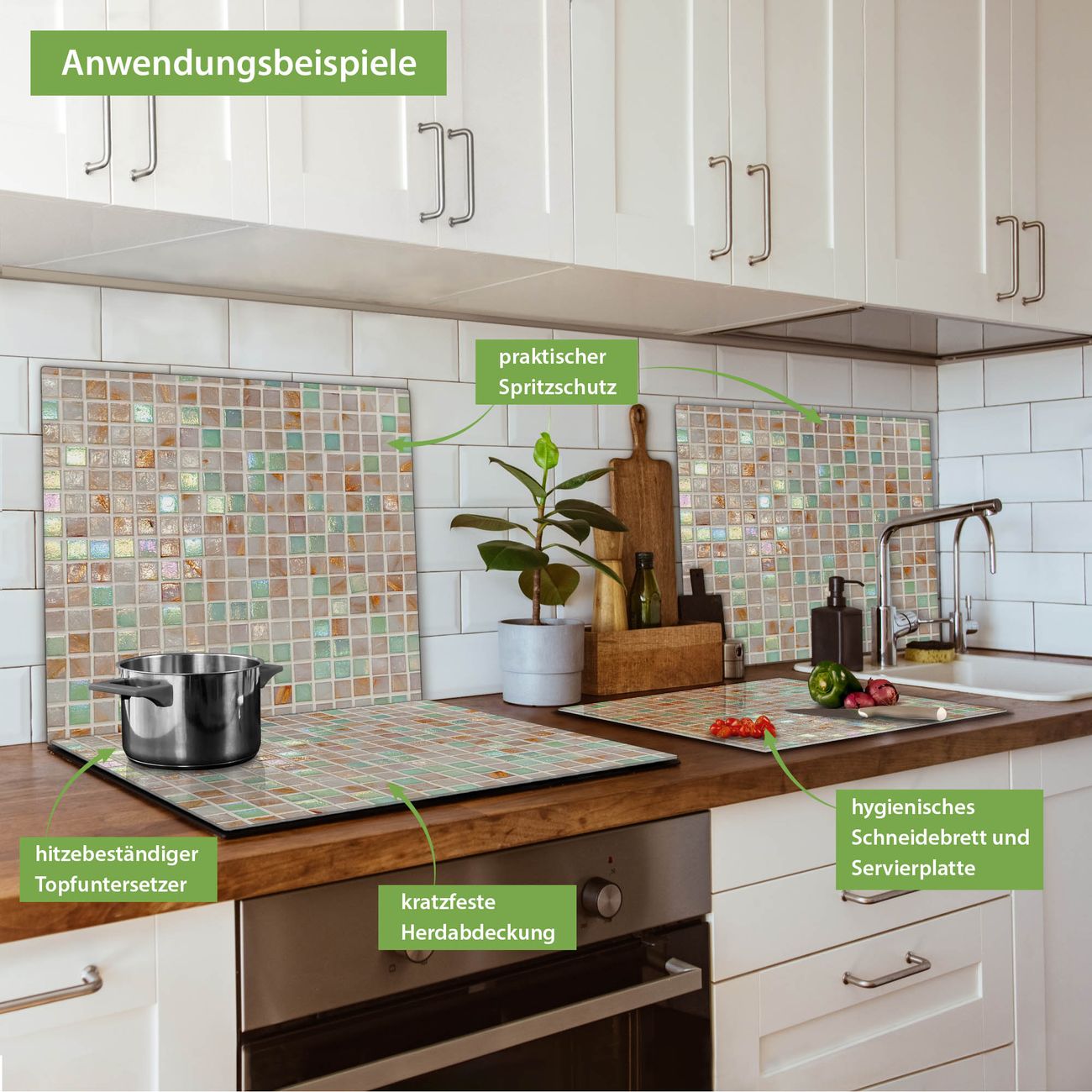 FUNKTION: Das banjado Schneidebrett mit Motiv Grüne Fliesen ist groß und rutschfest und damit ideal für Ihre Küche. Besonders praktisch. Das Schneidebrett ist vielseitig einsetzbar: ob als Spritzschutz hinter dem Herd für Ihre Küche oder als Glas Schneidebrett als hygienische und geruchsneutrale Unterlage. Sie können ebenfalls heiße Töpfe und Pfannen bis 100°C auf der Herdplattenabdeckung abstellen. Sie erhalten ein Multitalent für Ihre Küche. QUALITÄT: Die Schneideplatte Glas besteht aus hochwertigem, gehärtetem und hitzebeständigem Glas. Wählen Sie aus einem unserer zahlreichen Motive das passende Design für Ihre Küche aus. DETAILS: Das Schneidebrett Glas groß ist in verschiedenen Größen verfügbar. Sie erhalten separate Gumminoppen damit Ihr großes Schneidebrett rutschfest in der Küche steht. VIELSEITIG: Das Schneidebrett modern ist ein Allrounder - als Schneideunterlage Küche direkt auf dem Herd oder separat und als Spritzschutz an der Wand aufgestellt - ein praktisches Küchenutensil. BANJADO: Auf Wunsch fertigen wir das Glas Schneide Brett auch als Sondergröße an. Mehrteilige Platten sind auch möglich. Kontaktieren Sie uns gern für eine Spezialanfertigung Ihrer Glasplatte Küche.