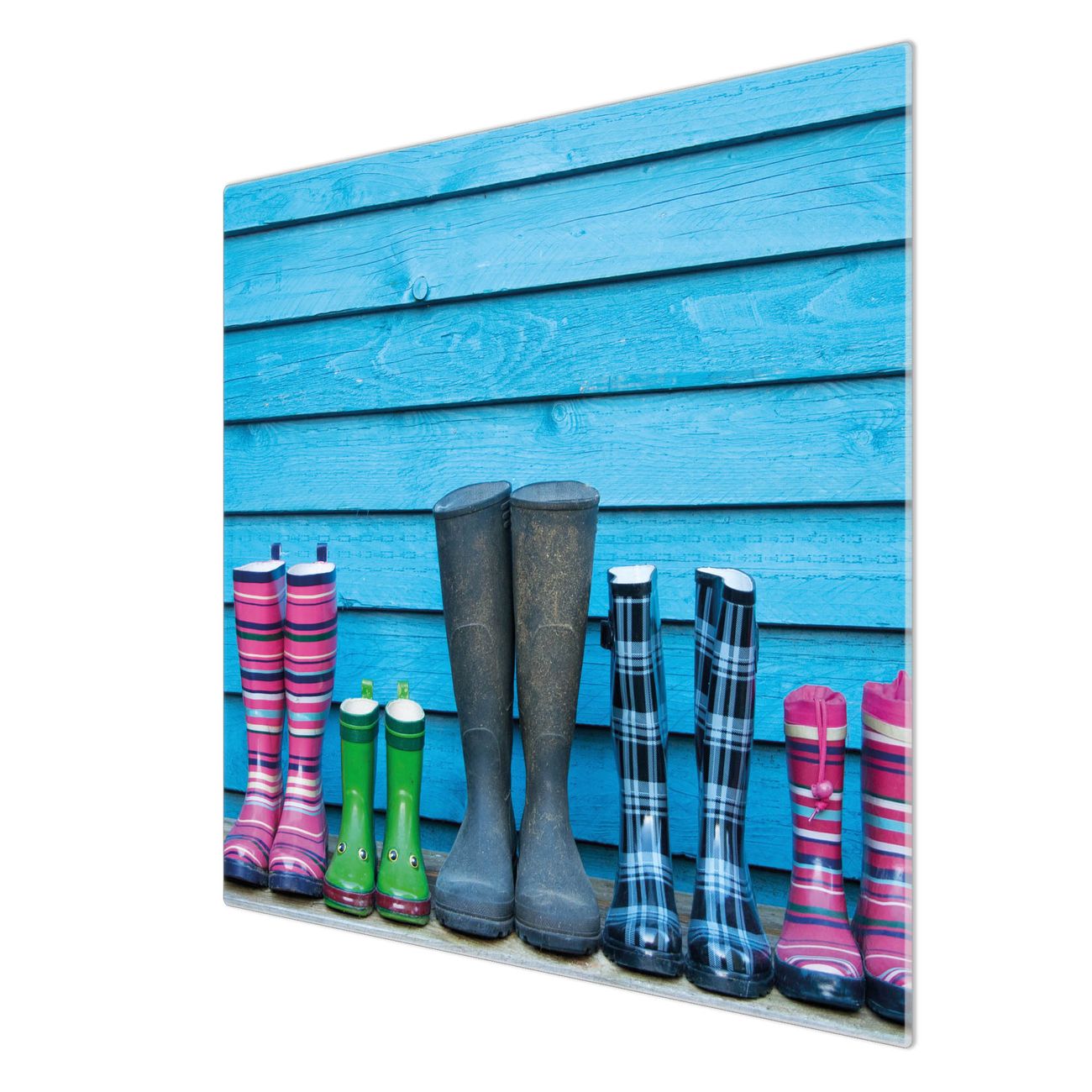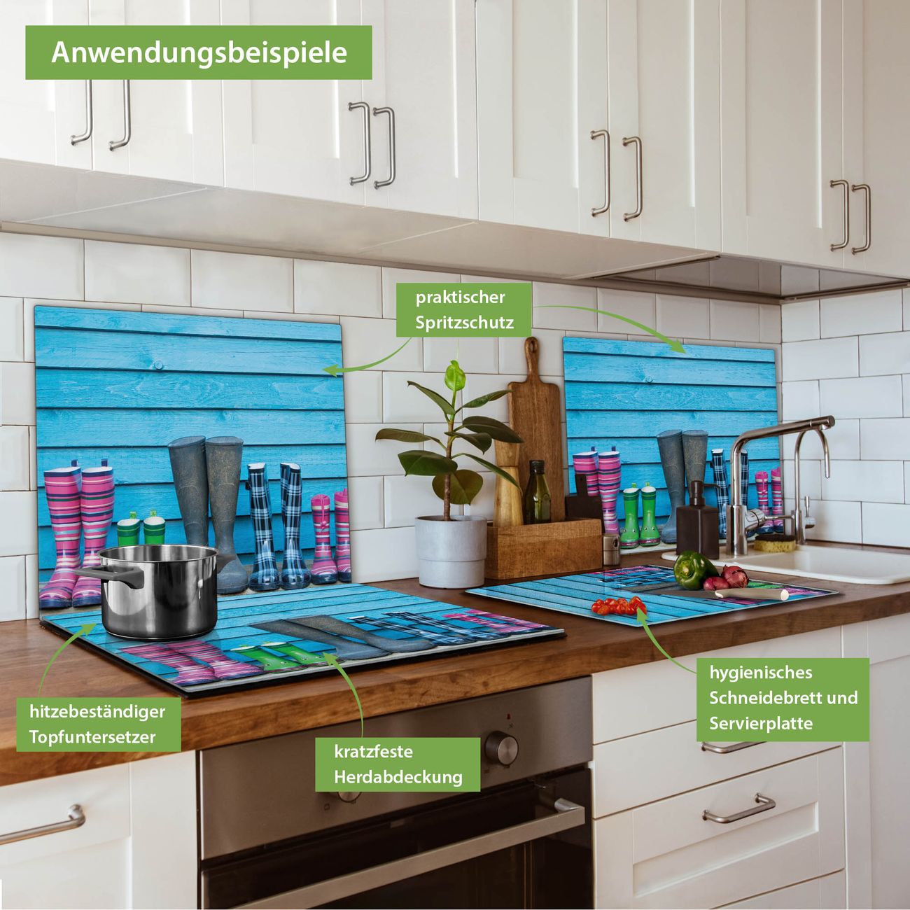FUNKTION: Das banjado Schneidebrett mit Motiv Gummistiefel ist groß und rutschfest und damit ideal für Ihre Küche. Besonders praktisch. Das Schneidebrett ist vielseitig einsetzbar: ob als Spritzschutz hinter dem Herd für Ihre Küche oder als Glas Schneidebrett als hygienische und geruchsneutrale Unterlage. Sie können ebenfalls heiße Töpfe und Pfannen bis 100°C auf der Herdplattenabdeckung abstellen. Sie erhalten ein Multitalent für Ihre Küche. QUALITÄT: Die Schneideplatte Glas besteht aus hochwertigem, gehärtetem und hitzebeständigem Glas. Wählen Sie aus einem unserer zahlreichen Motive das passende Design für Ihre Küche aus. DETAILS: Das Schneidebrett Glas groß ist in verschiedenen Größen verfügbar. Sie erhalten separate Gumminoppen damit Ihr großes Schneidebrett rutschfest in der Küche steht. VIELSEITIG: Das Schneidebrett modern ist ein Allrounder - als Schneideunterlage Küche direkt auf dem Herd oder separat und als Spritzschutz an der Wand aufgestellt - ein praktisches Küchenutensil. BANJADO: Auf Wunsch fertigen wir das Glas Schneide Brett auch als Sondergröße an. Mehrteilige Platten sind auch möglich. Kontaktieren Sie uns gern für eine Spezialanfertigung Ihrer Glasplatte Küche.