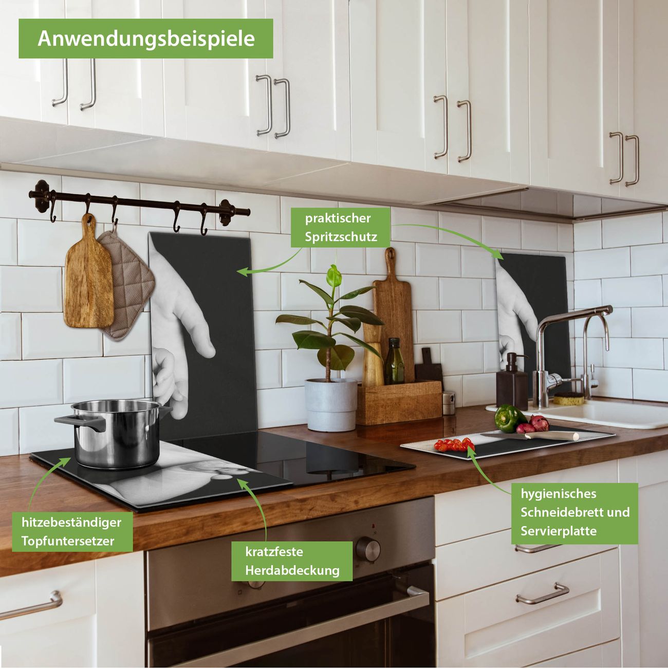 FUNKTION: Das banjado Schneidebrett mit Motiv Hands ist groß und rutschfest und damit ideal für Ihre Küche. Besonders praktisch. Das Schneidebrett ist vielseitig einsetzbar: ob als Spritzschutz hinter dem Herd für Ihre Küche oder als Glas Schneidebrett als hygienische und geruchsneutrale Unterlage. Sie können ebenfalls heiße Töpfe und Pfannen bis 100°C auf der Herdplattenabdeckung abstellen. Sie erhalten ein Multitalent für Ihre Küche. QUALITÄT: Die Schneideplatte Glas besteht aus hochwertigem, gehärtetem und hitzebeständigem Glas. Wählen Sie aus einem unserer zahlreichen Motive das passende Design für Ihre Küche aus. DETAILS: Das Schneidebrett Glas groß ist in verschiedenen Größen verfügbar. Sie erhalten separate Gumminoppen damit Ihr großes Schneidebrett rutschfest in der Küche steht. VIELSEITIG: Das Schneidebrett modern ist ein Allrounder - als Schneideunterlage Küche direkt auf dem Herd oder separat und als Spritzschutz an der Wand aufgestellt - ein praktisches Küchenutensil. BANJADO: Auf Wunsch fertigen wir das Glas Schneide Brett auch als Sondergröße an. Mehrteilige Platten sind auch möglich. Kontaktieren Sie uns gern für eine Spezialanfertigung Ihrer Glasplatte Küche.