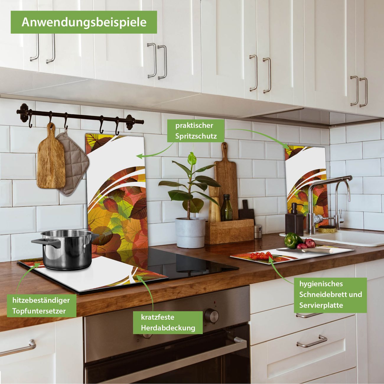 FUNKTION: Das banjado Schneidebrett mit Motiv Herbstlaub ist groß und rutschfest und damit ideal für Ihre Küche. Besonders praktisch. Das Schneidebrett ist vielseitig einsetzbar: ob als Spritzschutz hinter dem Herd für Ihre Küche oder als Glas Schneidebrett als hygienische und geruchsneutrale Unterlage. Sie können ebenfalls heiße Töpfe und Pfannen bis 100°C auf der Herdplattenabdeckung abstellen. Sie erhalten ein Multitalent für Ihre Küche. QUALITÄT: Die Schneideplatte Glas besteht aus hochwertigem, gehärtetem und hitzebeständigem Glas. Wählen Sie aus einem unserer zahlreichen Motive das passende Design für Ihre Küche aus. DETAILS: Das Schneidebrett Glas groß ist in verschiedenen Größen verfügbar. Sie erhalten separate Gumminoppen damit Ihr großes Schneidebrett rutschfest in der Küche steht. VIELSEITIG: Das Schneidebrett modern ist ein Allrounder - als Schneideunterlage Küche direkt auf dem Herd oder separat und als Spritzschutz an der Wand aufgestellt - ein praktisches Küchenutensil. BANJADO: Auf Wunsch fertigen wir das Glas Schneide Brett auch als Sondergröße an. Mehrteilige Platten sind auch möglich. Kontaktieren Sie uns gern für eine Spezialanfertigung Ihrer Glasplatte Küche.