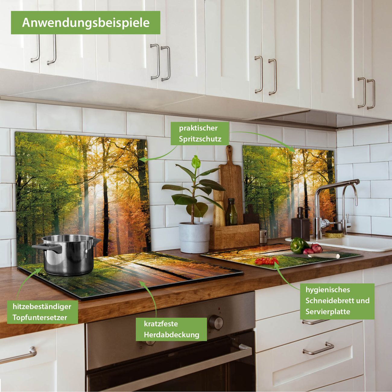 FUNKTION: Das banjado Schneidebrett mit Motiv Herbstwald ist groß und rutschfest und damit ideal für Ihre Küche. Besonders praktisch. Das Schneidebrett ist vielseitig einsetzbar: ob als Spritzschutz hinter dem Herd für Ihre Küche oder als Glas Schneidebrett als hygienische und geruchsneutrale Unterlage. Sie können ebenfalls heiße Töpfe und Pfannen bis 100°C auf der Herdplattenabdeckung abstellen. Sie erhalten ein Multitalent für Ihre Küche. QUALITÄT: Die Schneideplatte Glas besteht aus hochwertigem, gehärtetem und hitzebeständigem Glas. Wählen Sie aus einem unserer zahlreichen Motive das passende Design für Ihre Küche aus. DETAILS: Das Schneidebrett Glas groß ist in verschiedenen Größen verfügbar. Sie erhalten separate Gumminoppen damit Ihr großes Schneidebrett rutschfest in der Küche steht. VIELSEITIG: Das Schneidebrett modern ist ein Allrounder - als Schneideunterlage Küche direkt auf dem Herd oder separat und als Spritzschutz an der Wand aufgestellt - ein praktisches Küchenutensil. BANJADO: Auf Wunsch fertigen wir das Glas Schneide Brett auch als Sondergröße an. Mehrteilige Platten sind auch möglich. Kontaktieren Sie uns gern für eine Spezialanfertigung Ihrer Glasplatte Küche.