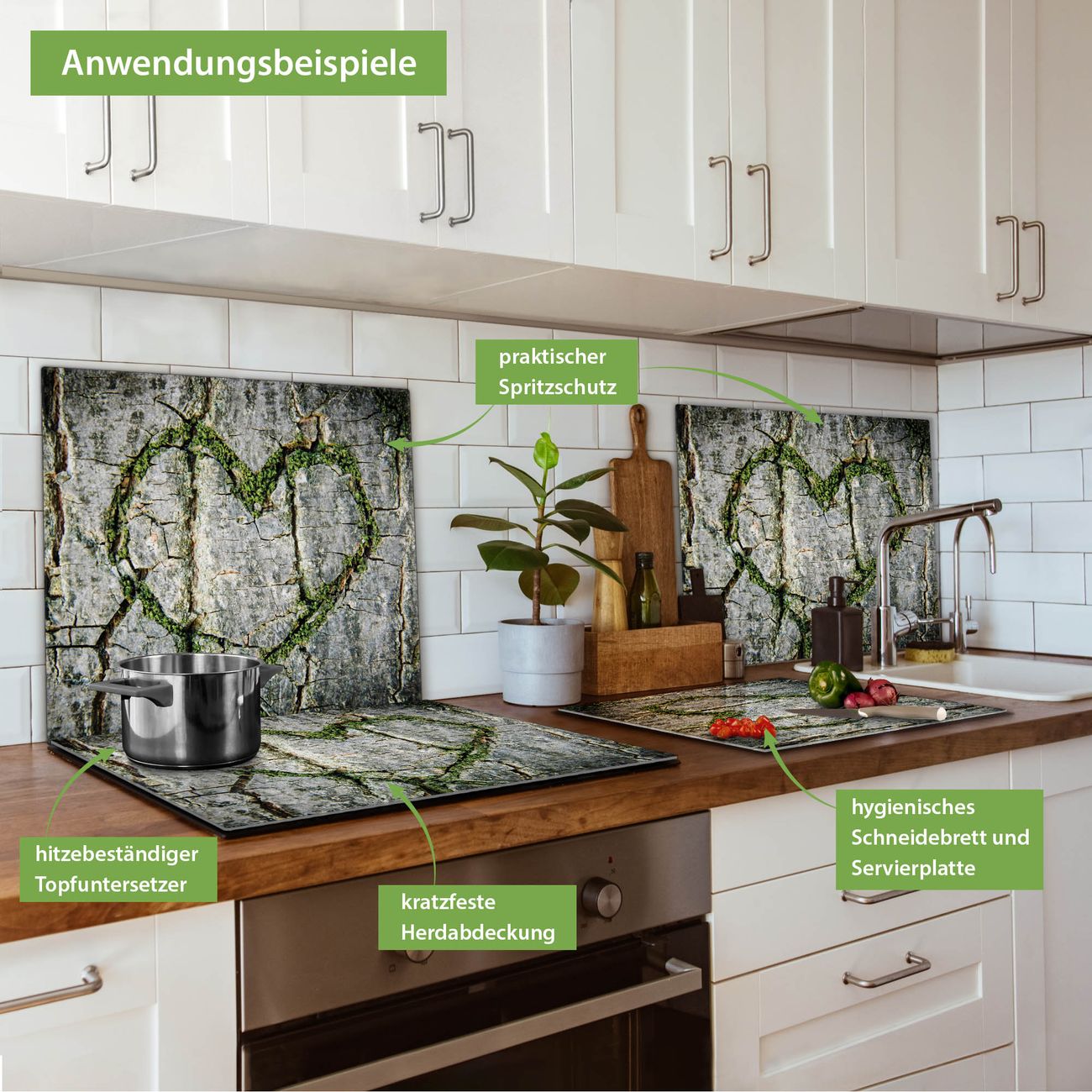 FUNKTION: Das banjado Schneidebrett mit Motiv Herz Aus Moos ist groß und rutschfest und damit ideal für Ihre Küche. Besonders praktisch. Das Schneidebrett ist vielseitig einsetzbar: ob als Spritzschutz hinter dem Herd für Ihre Küche oder als Glas Schneidebrett als hygienische und geruchsneutrale Unterlage. Sie können ebenfalls heiße Töpfe und Pfannen bis 100°C auf der Herdplattenabdeckung abstellen. Sie erhalten ein Multitalent für Ihre Küche. QUALITÄT: Die Schneideplatte Glas besteht aus hochwertigem, gehärtetem und hitzebeständigem Glas. Wählen Sie aus einem unserer zahlreichen Motive das passende Design für Ihre Küche aus. DETAILS: Das Schneidebrett Glas groß ist in verschiedenen Größen verfügbar. Sie erhalten separate Gumminoppen damit Ihr großes Schneidebrett rutschfest in der Küche steht. VIELSEITIG: Das Schneidebrett modern ist ein Allrounder - als Schneideunterlage Küche direkt auf dem Herd oder separat und als Spritzschutz an der Wand aufgestellt - ein praktisches Küchenutensil. BANJADO: Auf Wunsch fertigen wir das Glas Schneide Brett auch als Sondergröße an. Mehrteilige Platten sind auch möglich. Kontaktieren Sie uns gern für eine Spezialanfertigung Ihrer Glasplatte Küche.