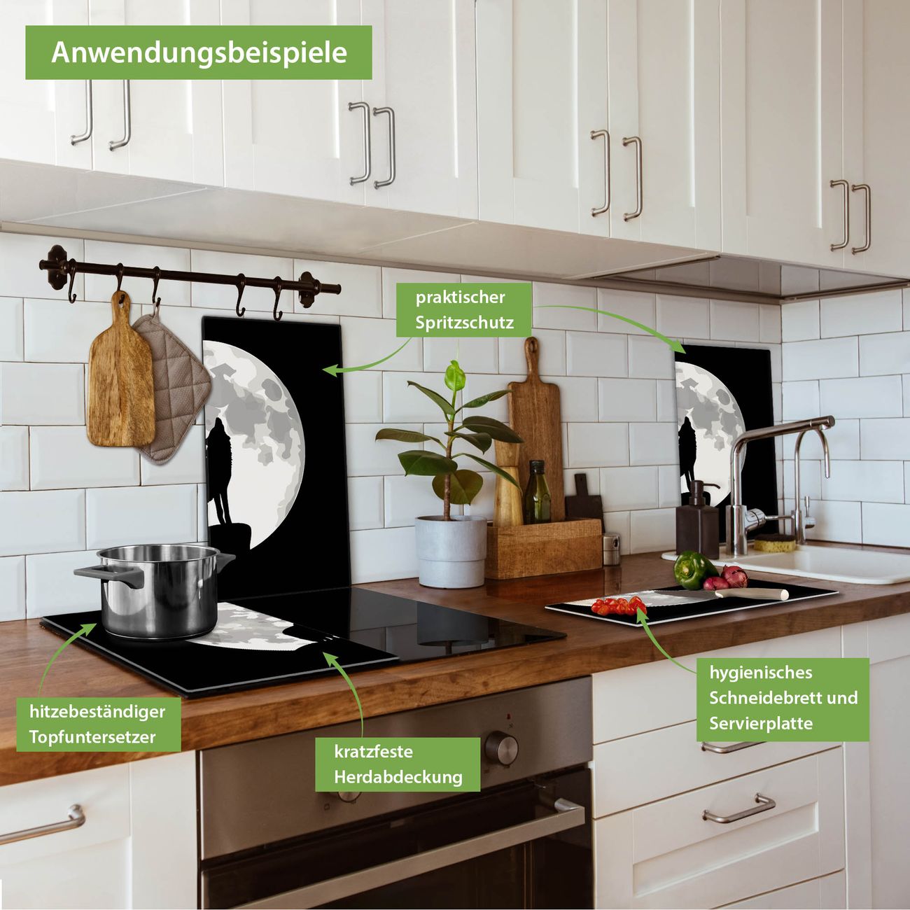 FUNKTION: Das banjado Schneidebrett mit Motiv Heulender Wolf SW ist groß und rutschfest und damit ideal für Ihre Küche. Besonders praktisch. Das Schneidebrett ist vielseitig einsetzbar: ob als Spritzschutz hinter dem Herd für Ihre Küche oder als Glas Schneidebrett als hygienische und geruchsneutrale Unterlage. Sie können ebenfalls heiße Töpfe und Pfannen bis 100°C auf der Herdplattenabdeckung abstellen. Sie erhalten ein Multitalent für Ihre Küche. QUALITÄT: Die Schneideplatte Glas besteht aus hochwertigem, gehärtetem und hitzebeständigem Glas. Wählen Sie aus einem unserer zahlreichen Motive das passende Design für Ihre Küche aus. DETAILS: Das Schneidebrett Glas groß ist in verschiedenen Größen verfügbar. Sie erhalten separate Gumminoppen damit Ihr großes Schneidebrett rutschfest in der Küche steht. VIELSEITIG: Das Schneidebrett modern ist ein Allrounder - als Schneideunterlage Küche direkt auf dem Herd oder separat und als Spritzschutz an der Wand aufgestellt - ein praktisches Küchenutensil. BANJADO: Auf Wunsch fertigen wir das Glas Schneide Brett auch als Sondergröße an. Mehrteilige Platten sind auch möglich. Kontaktieren Sie uns gern für eine Spezialanfertigung Ihrer Glasplatte Küche.